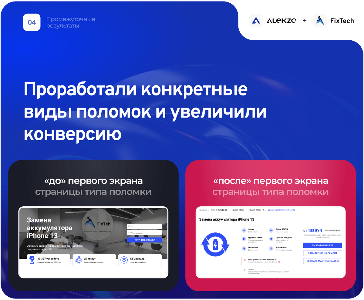 Вторым ключевым инсайтом стали страницы с конкретными видами поломок (например, «Замена экрана iPhone 14»). Проработав UX первого экрана на этих страницах, мы подняли конверсию по ним с 2,6% до 4,7%.