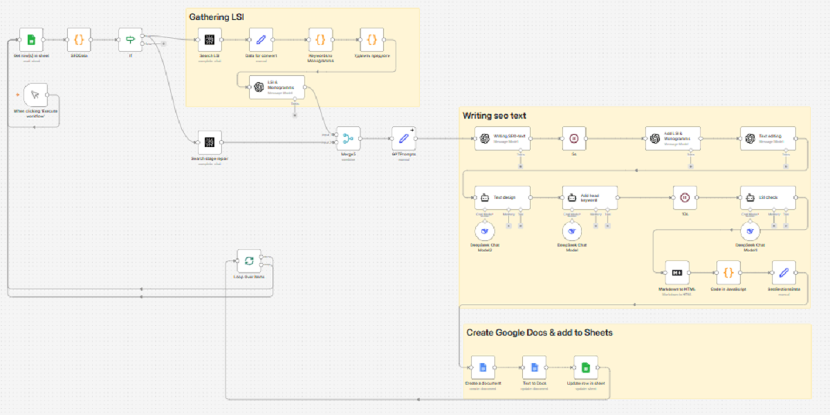 - Сбор LSI слов и семантически близких n-грамм для основного ключевого слова, которое берется из таблицы с страницами на создание. Первая структура цепочки была проще и содержала написание и редактуру текста. Этого было недостаточно для полноценного seo-текста, который наполнял бы страницу нужными словами и ключами. Поэтому после мы составили отдельный узел с поиском LSI слов и проверкой их добавления.