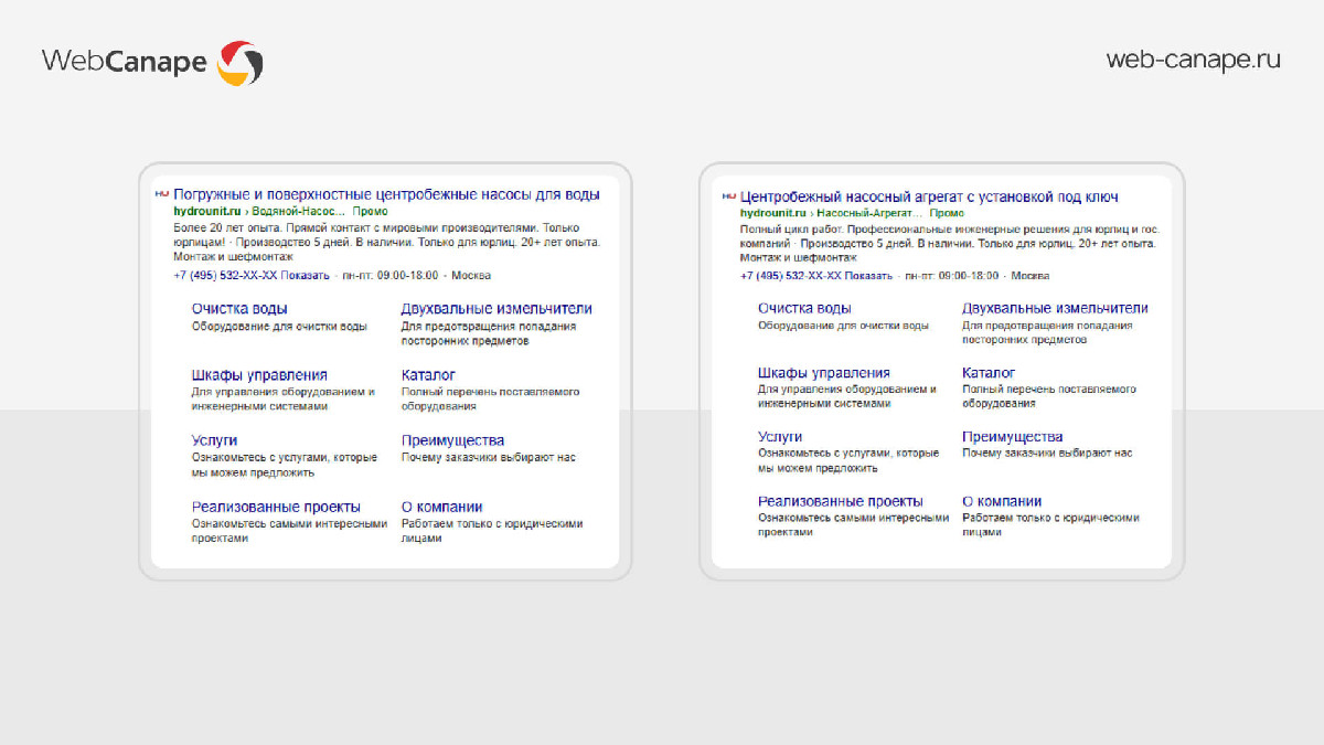 Отдельное внимание уделили качеству трафика. «Гидроюнит» работает только с юридическими лицами, поэтому часть аудитории изначально была нецелевой — пользователи, которые ищут насосы для частных или бытовых задач. Чтобы не тратить бюджет на такие переходы, в каждом объявлении прямо указали, что компания сотрудничает только с юрлицами. Эту информацию добавили в тексты и уточнения.
