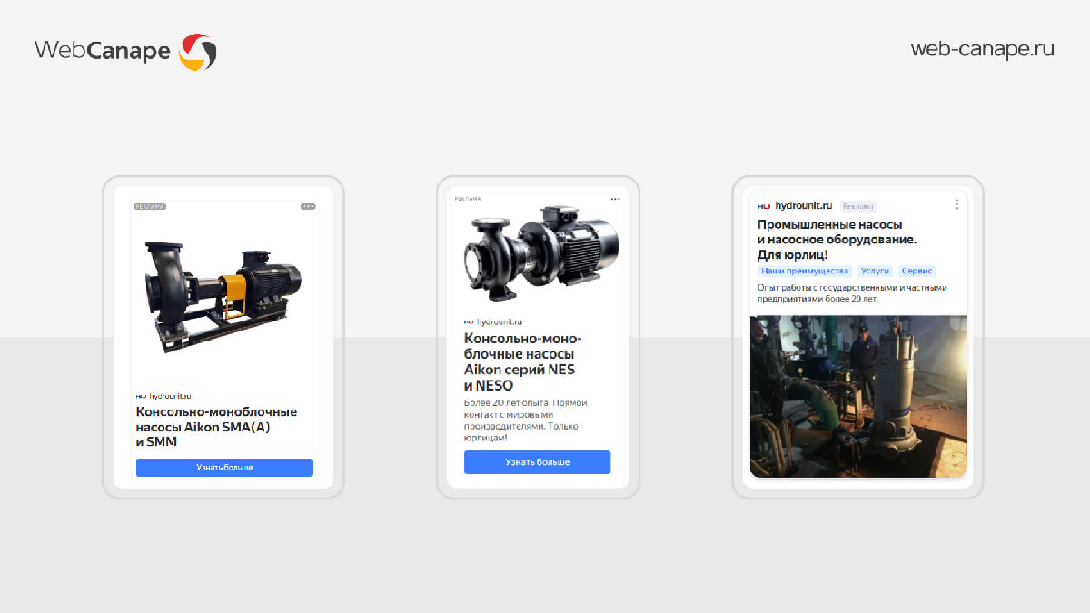 Поскольку компания работает только с юридическими лицами, для рекламы было важно сразу отсечь частный спрос и не тратить бюджет на пользователей, которым нужны насосы для бытовых задач.
