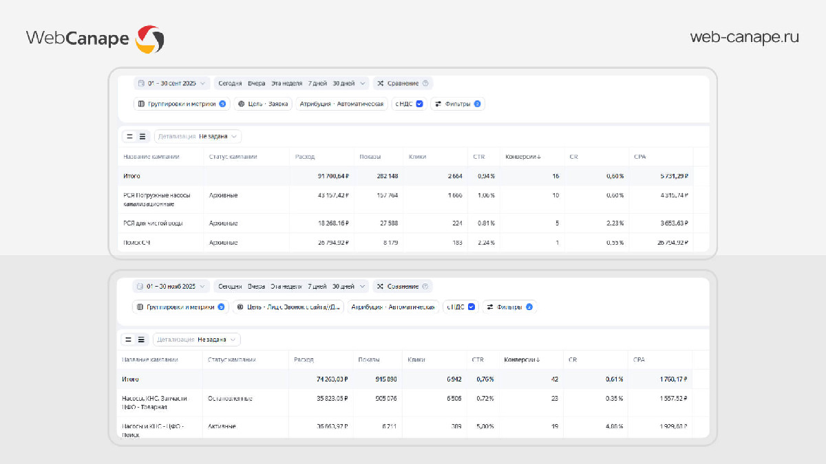 После пересборки кампаний усилили работу с горячим спросом — пользователями, которые уже ищут конкретное оборудование или решения.