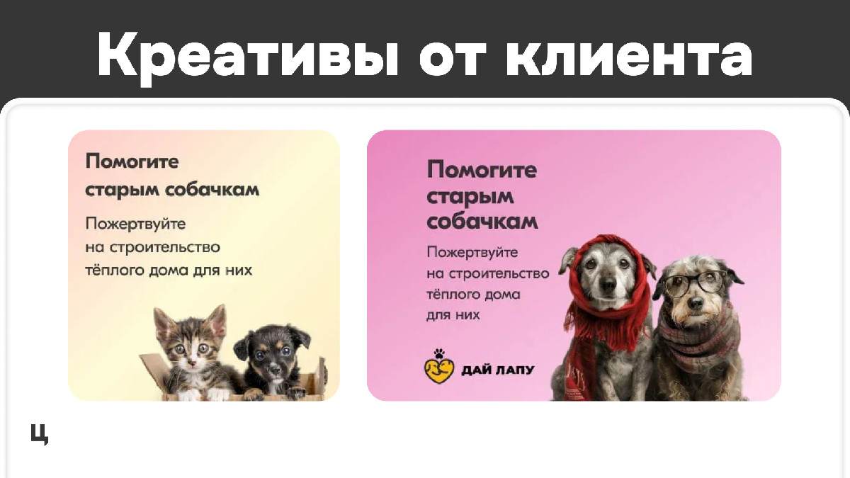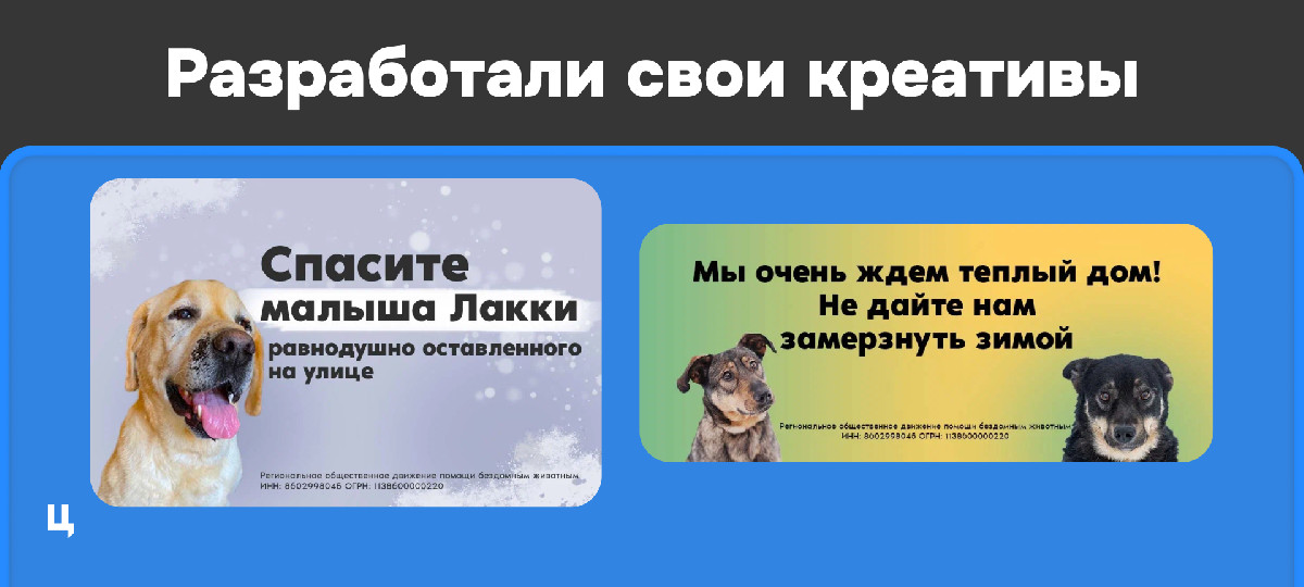 Акцент в креативах был на том, что животные пожилые и нуждаются в теплом жилье. Использовали их как в статичном, так и в видеоформате.