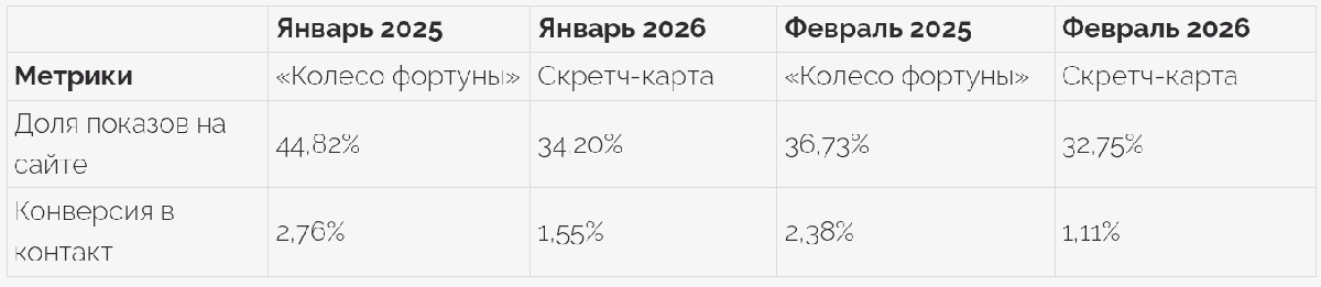 Мы предполагаем, что при более низкой конверсии в контакт скретч-карта может показать высокую конверсию в покупателя. Ведь теоретически она отсеивает нецелевые контакты. А значит, база, собранная с её помощью, принесёт больше выручки. Но на этом проекте достаточно длинный период принятия решения, сейчас мы отследить этот момент не можем. Поэтому будем тестировать новые варианты механик для достижения максимального результата.