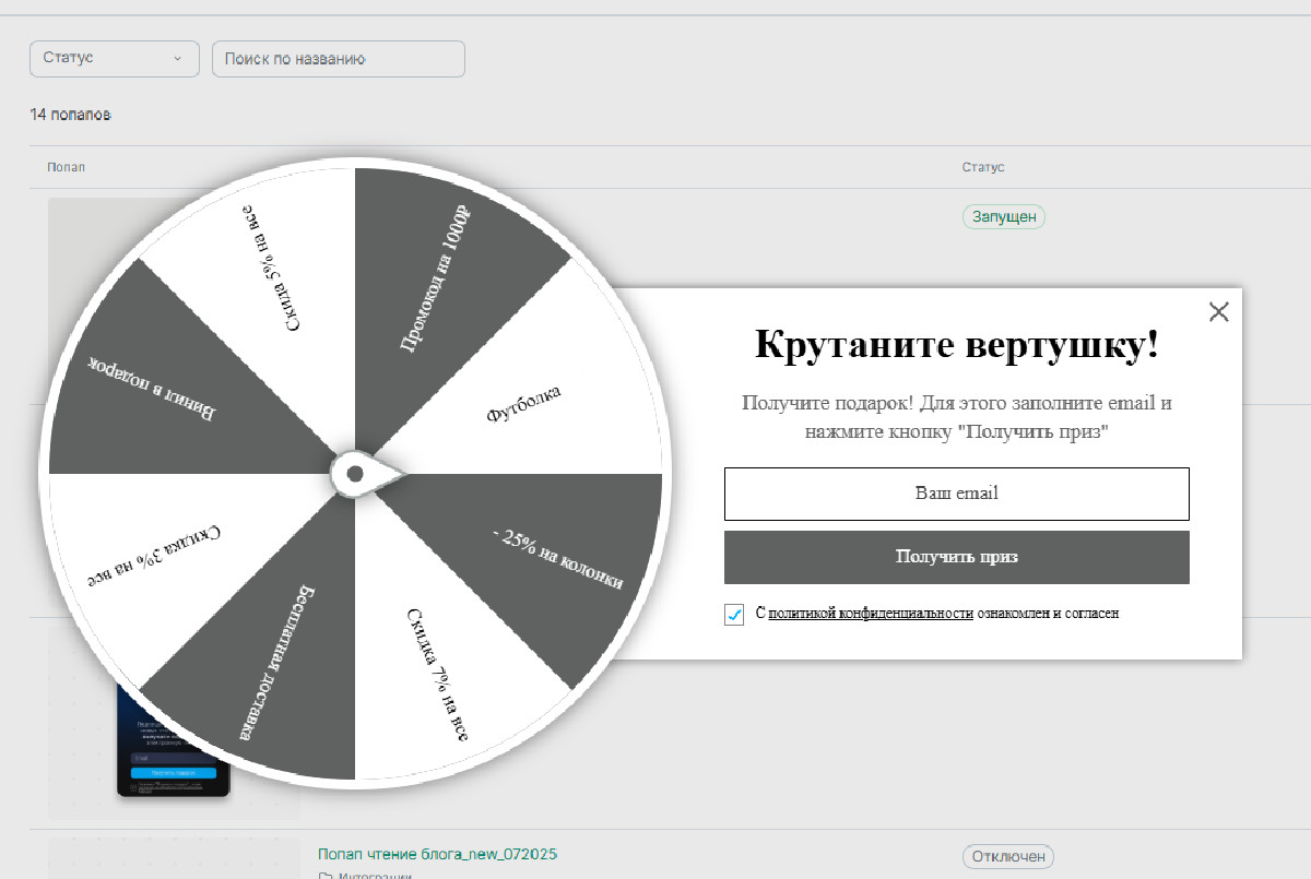 Учитывая показатели наших всплывающих окон, мы планируем тестировать другие механики, разные визуалы и варианты подарков (лид-магнитов).