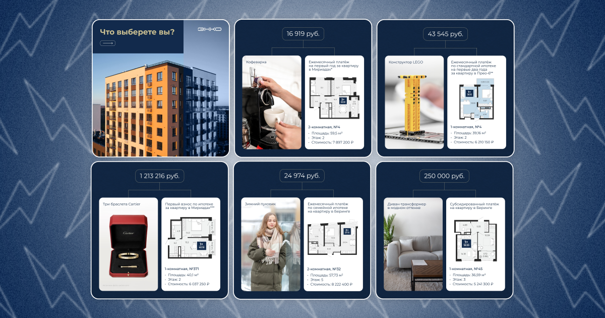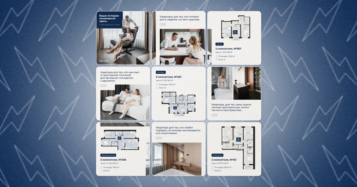 Сложные финансовые условия мы переводили в понятные и визуально выразительные форматы. Подключали ИИ, а также создавали креативные карточки, которые выделялись в ленте и удерживали внимание. Вместо сухих формулировок — жизненные сценарии, реальные примеры экономии и ситуации, в которых покупка квартиры становится ощутимым улучшением качества жизни, а не набором цифр и процентов.