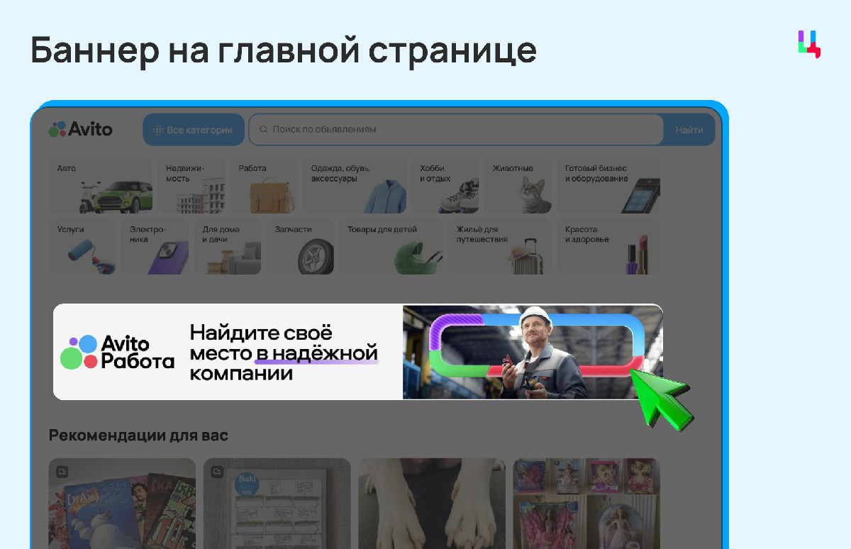 Бизнес может запускать на Авито Click-out-объявления. Это когда рекламные баннеры видят посетители площадки (уже заинтересованные в товарах и услугах), а по клику попадают на сайт или приложение бренда.