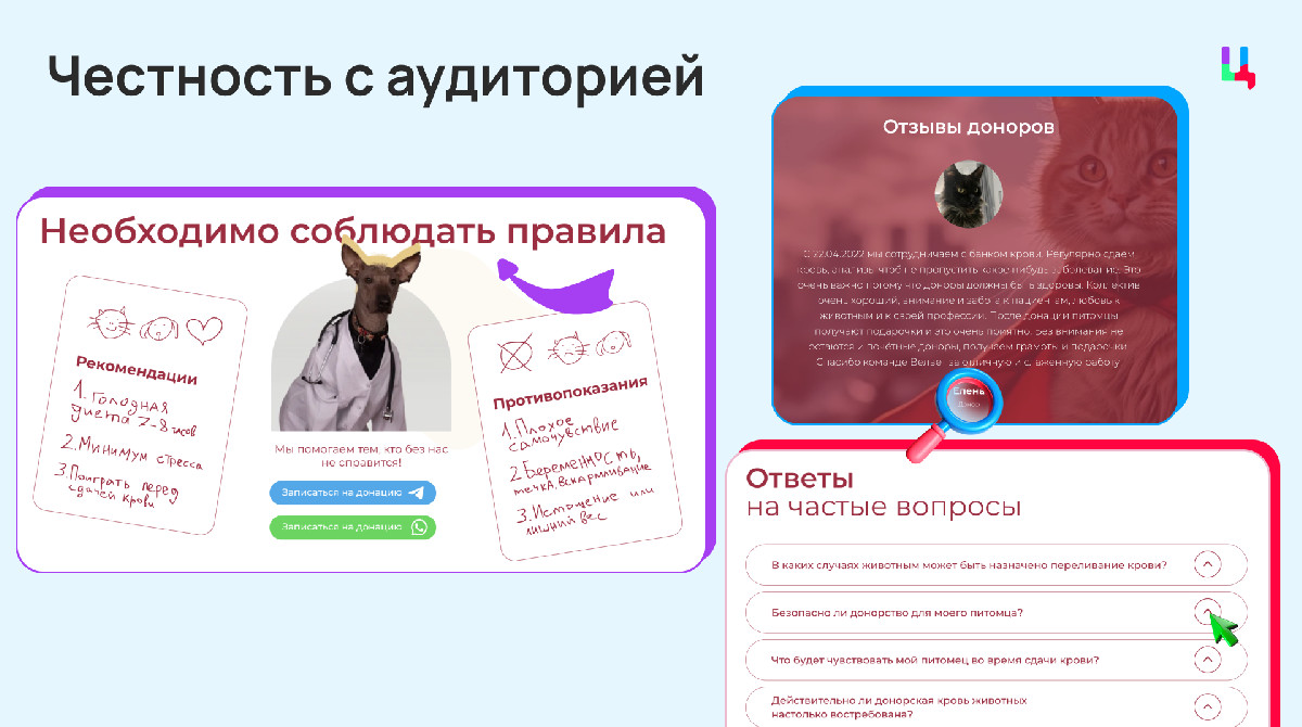 Также здесь перечислена основная информация о донорстве, которую нужно знать хозяину питомца. Такой подход снижает тревогу и повышает доверие.