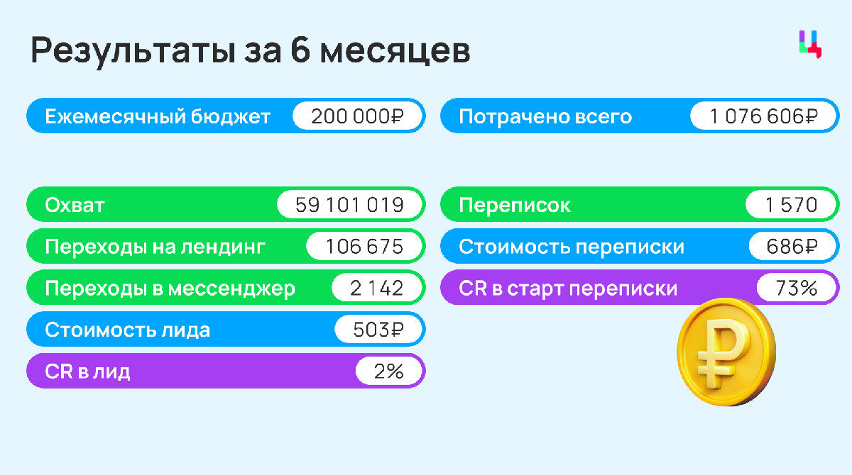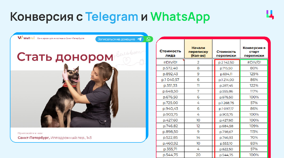 Единственное, помимо связи через Telegram добавила Whatsapp и подменный номер телефона, чтобы определять звонки именно с нашей рекламы. Этот небольшой шаг привел к росту конверсии в переписку — с 32% до 92% в среднем.