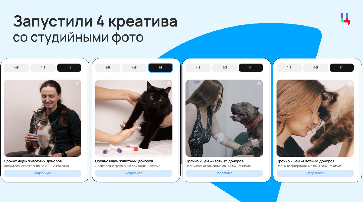 Вельвет — тот случай, когда продукт / услуга продает сам себя. Поэтому задача креативов здесь проста — проинформировать аудиторию о существовании такой опции как донорство для питомцев. В остальном, нам предстояло периодически менять фото на баннерах, чтобы избежать замыленности взгляда.