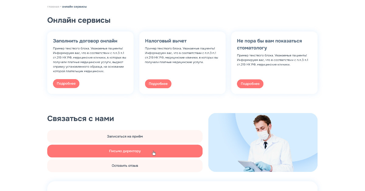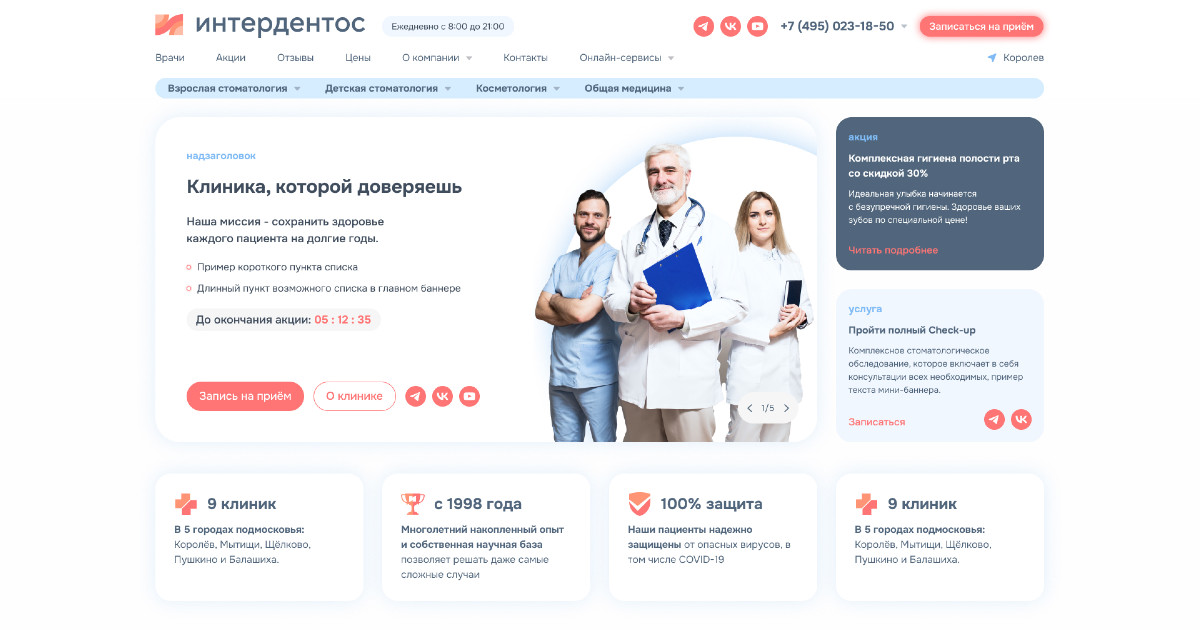 5. Финальный этап - наполнение и тестирование. Наполнение производилось совместно с клиентом, а сам сайт проверяли не только технически, но и логически: удобно ли искать врача, услуги, цены, акции, не ломаются ли сценарии при выборе города.