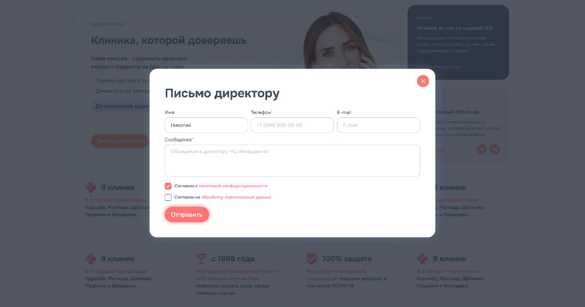 Отдельное внимание уделили мультирегиональности: пользователь может выбрать свой город и видеть релевантные акции, врачей, контакты, цены и вакансии. Это сразу решило проблему масштабируемости и упростило работу маркетинга.