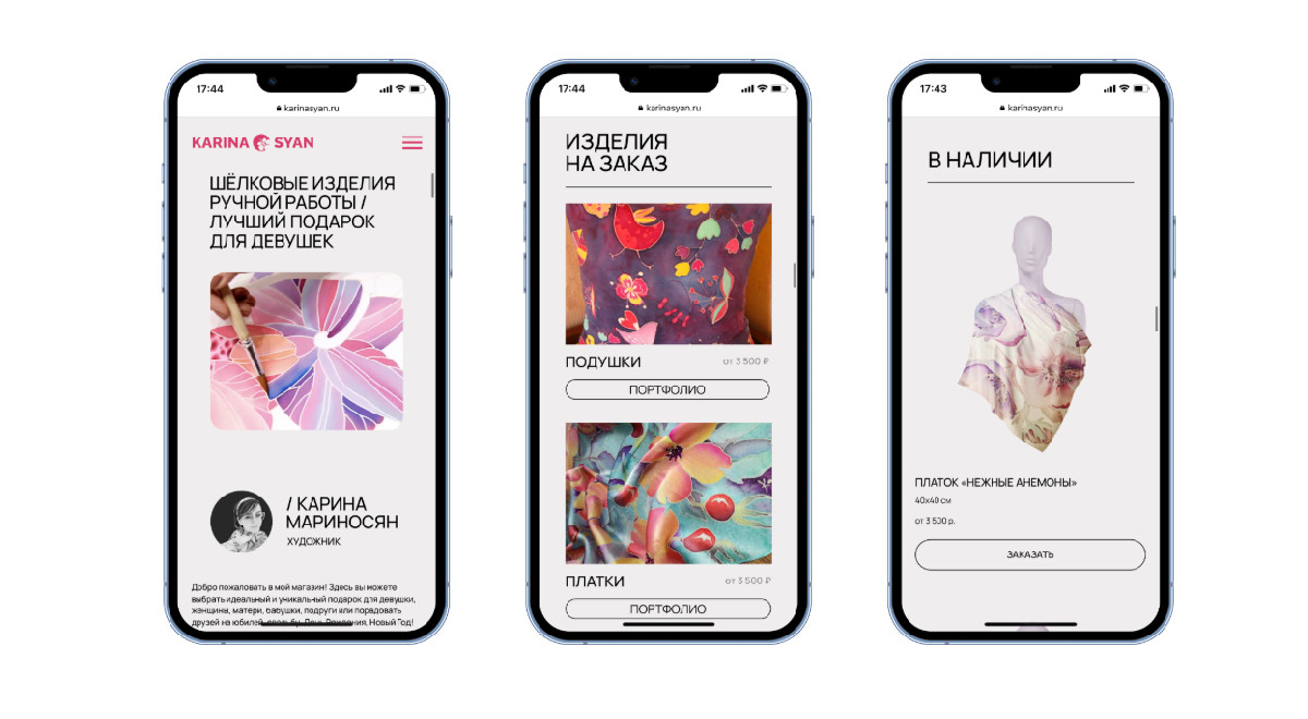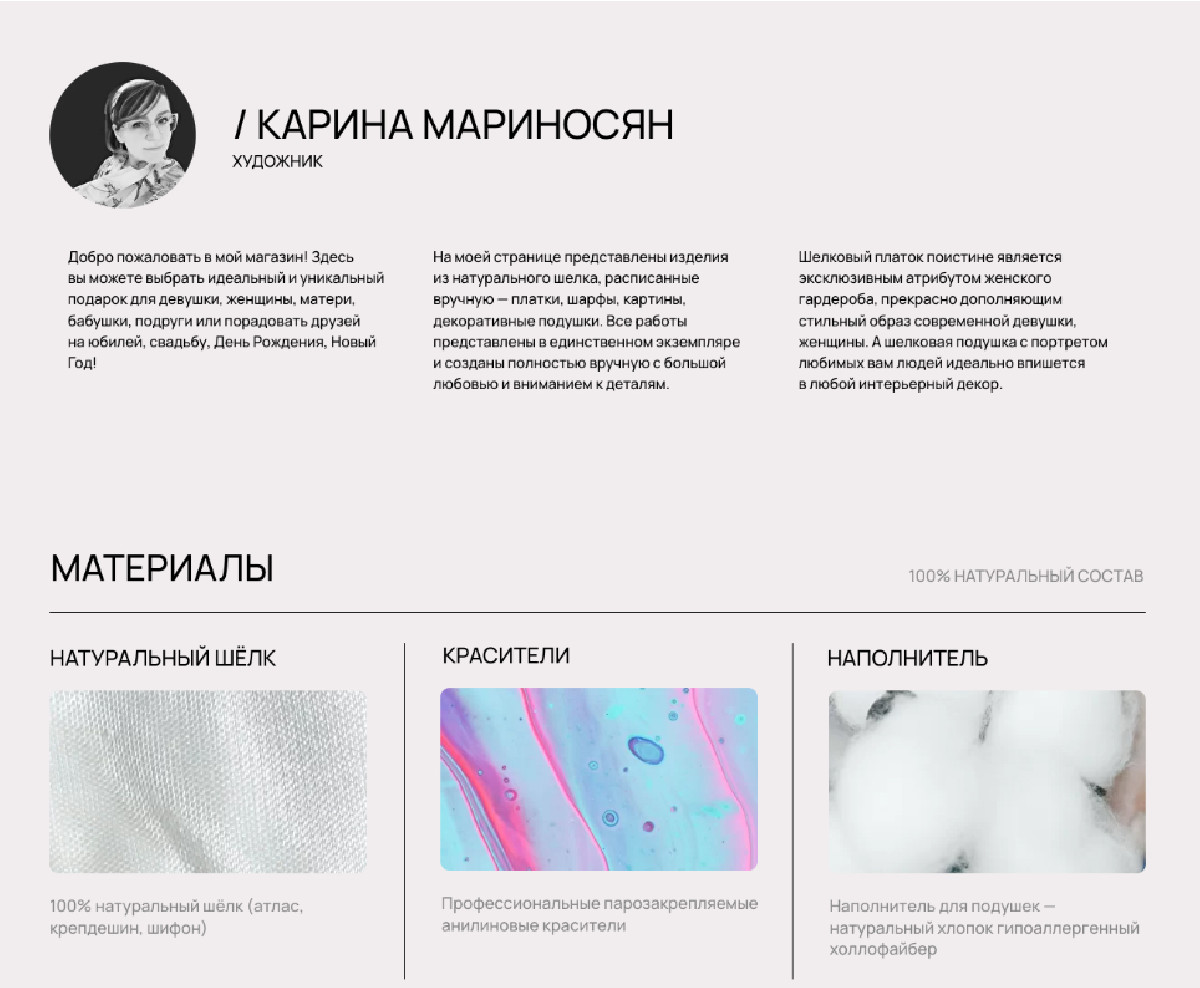 Художник и дизайнер Карина Мариносян создаёт уникальные изделия из натурального шелка, расписанные вручную — платки, шарфы, картины, декоративные подушки. Все работы представлены в единственном экземпляре. На сайте можно купить готовые изделия, либо заказать индивидуальные.