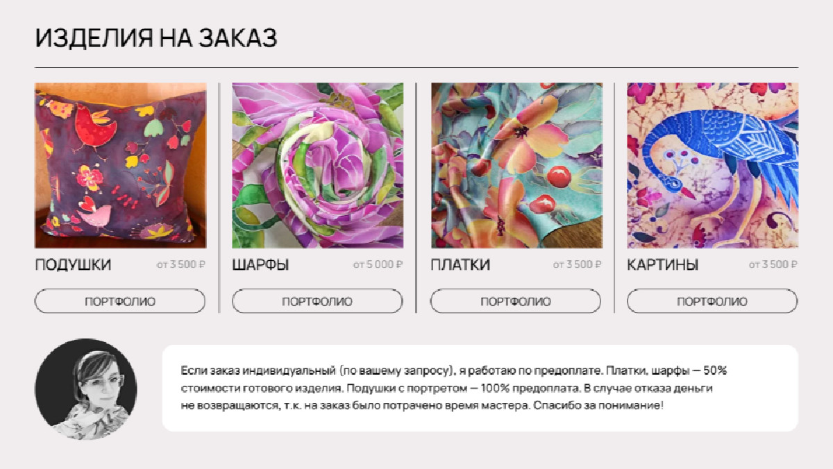 - Помогает продавать готовые изделия и принимать заказы на индивидуальные работы