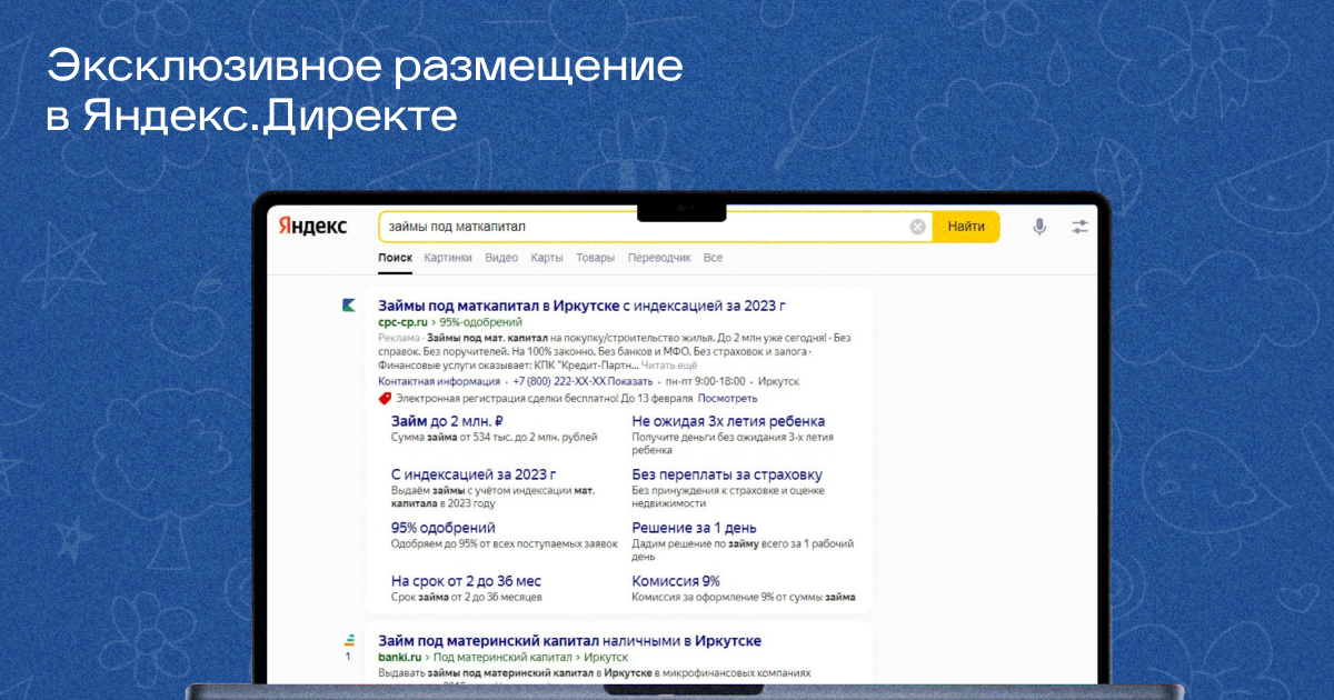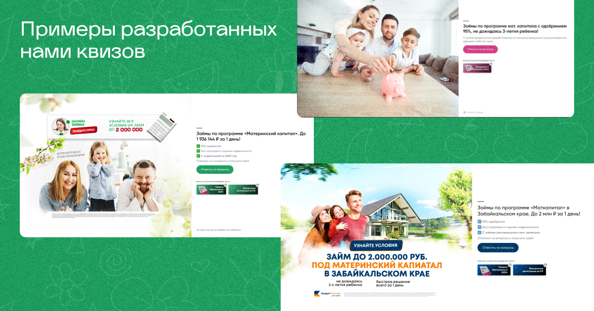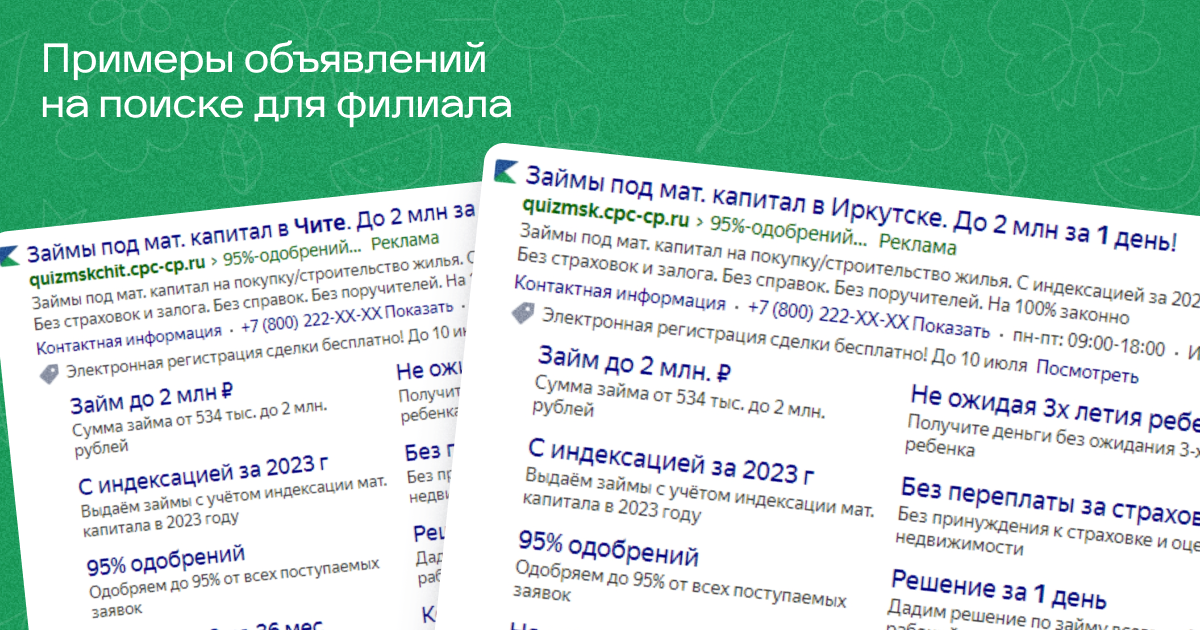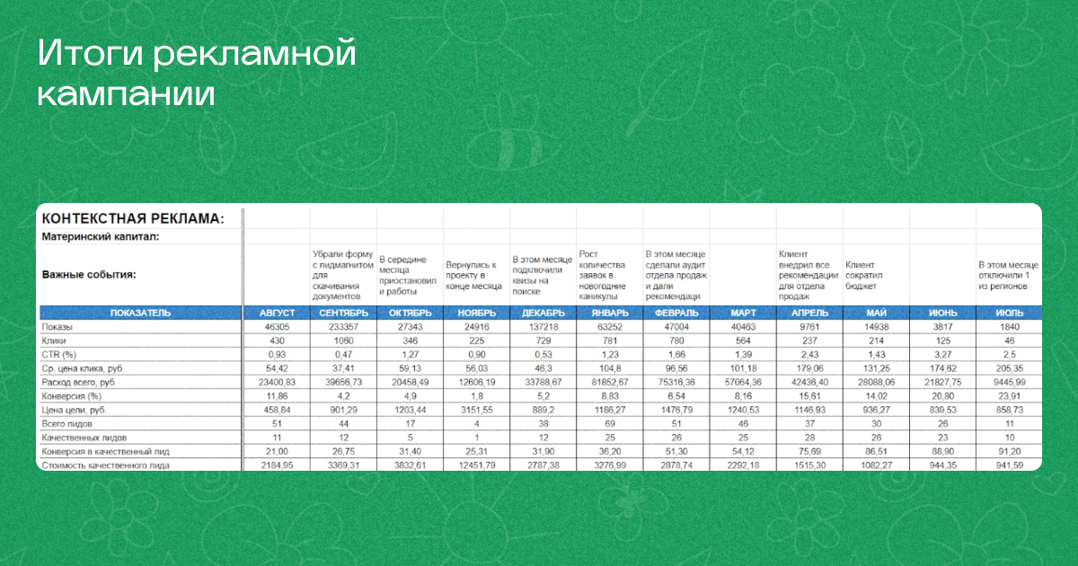 Мы убедили клиента использовать околоцелевые запросы (например, «обналичить маткапитал»). Клиенты часто используют такие формулировки из-за некомпетентности в процедуре, оставаясь при этом целевыми. Практика подтвердила нашу правоту — большинство таких заявок оказались качественными.