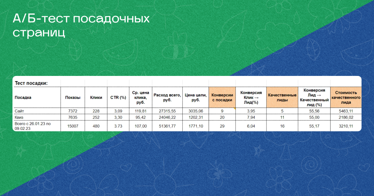 Также был проведен А/Б-тест между сайтом и квизом. Сайт давал более качественные лиды (конверсия в качество 55,56% против 55% у квиза), но квиз генерировал в 2 раза больше заявок по цене в 2 раза ниже.