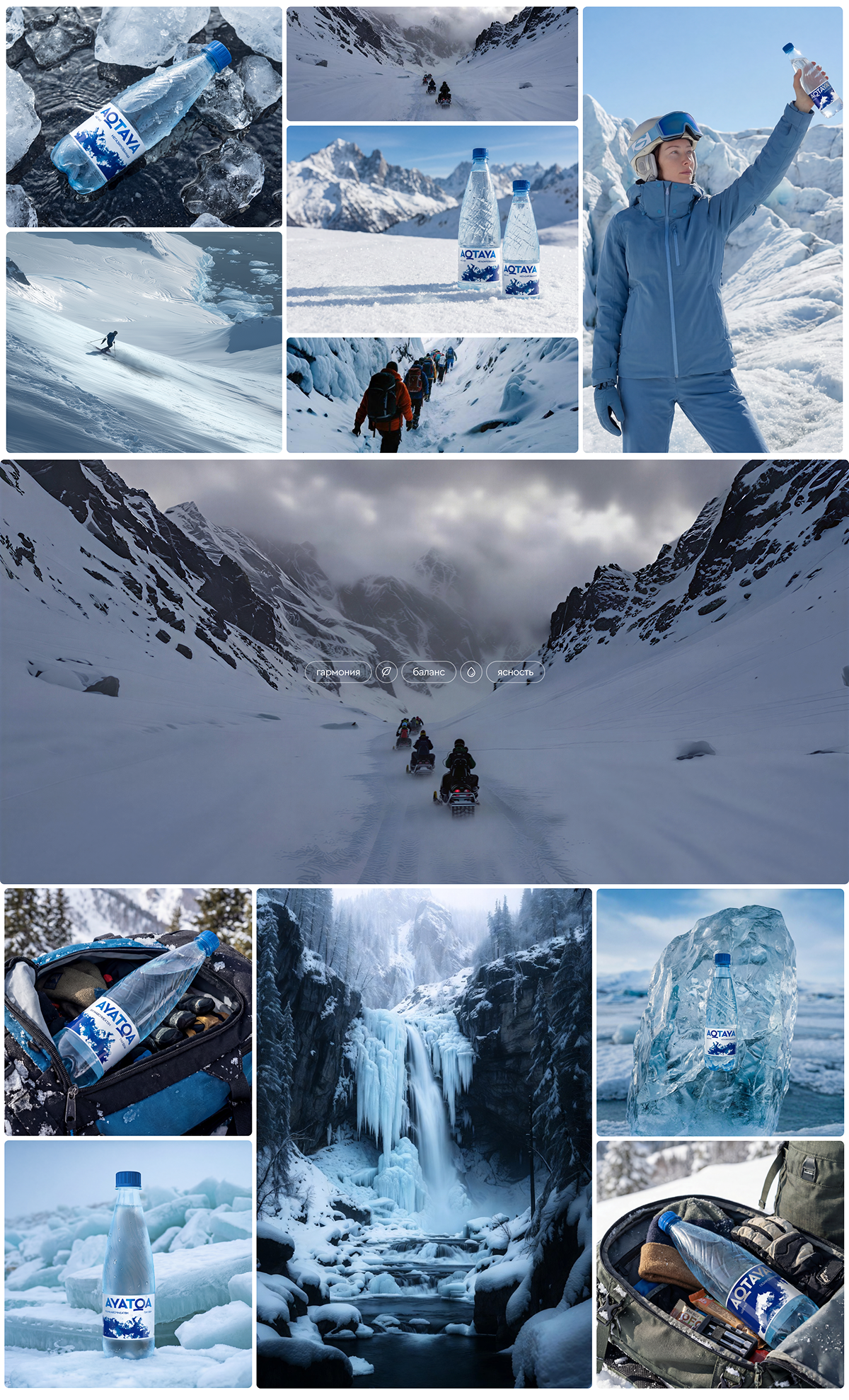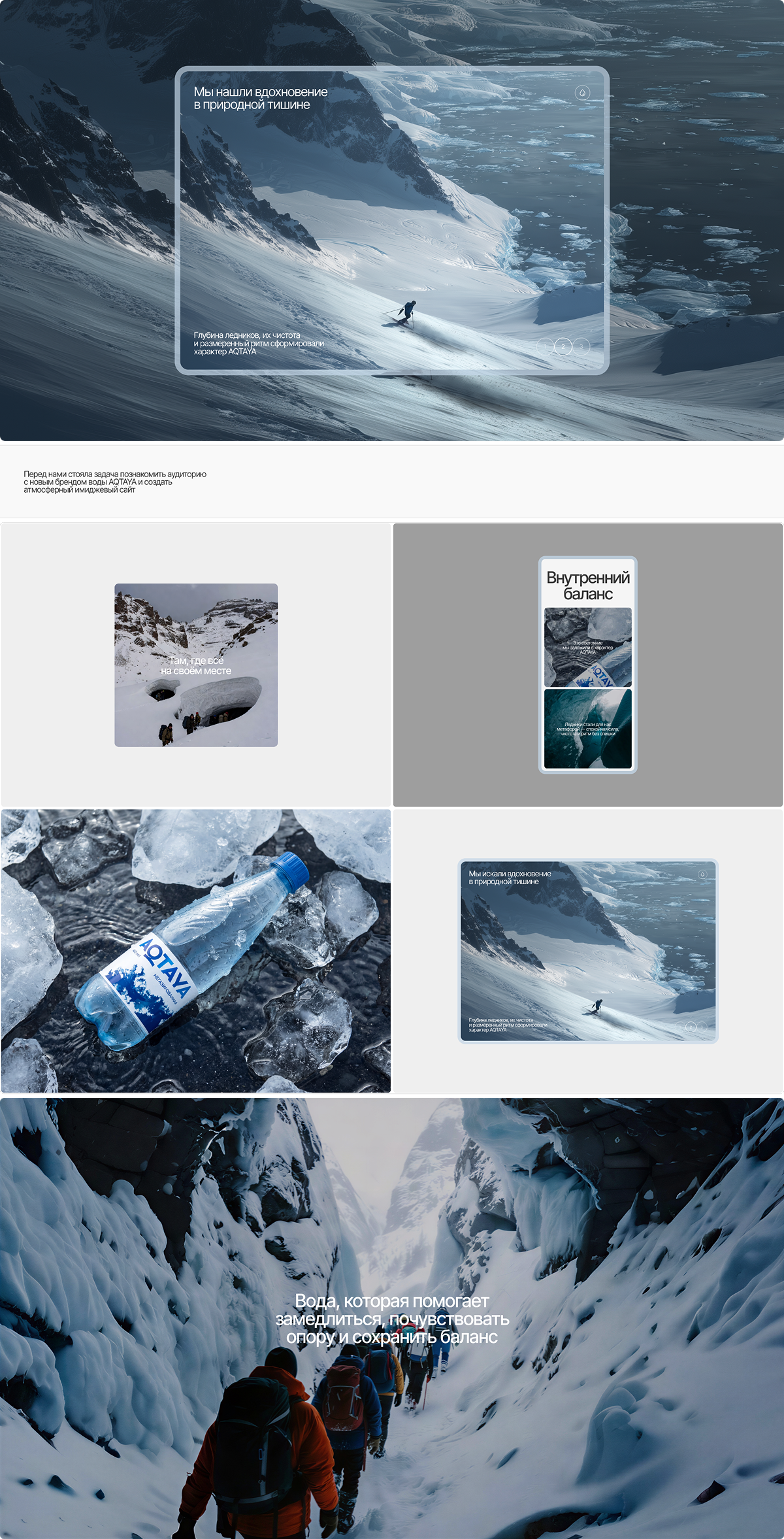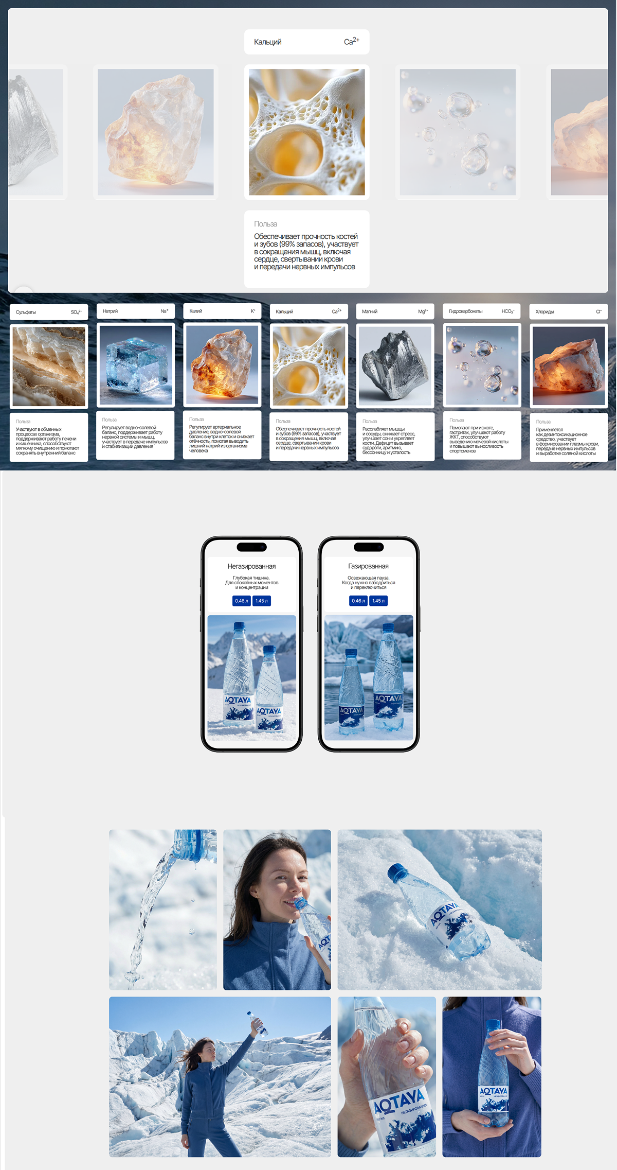 Особенность проекта в том, что практически все изображения на сайте сгенерированы. Они помогли создать целостный визуальный язык и передать ценности бренда воды AQTAYA: спокойствие, баланс, ощущение чистоты и внутреннего вдохновения.