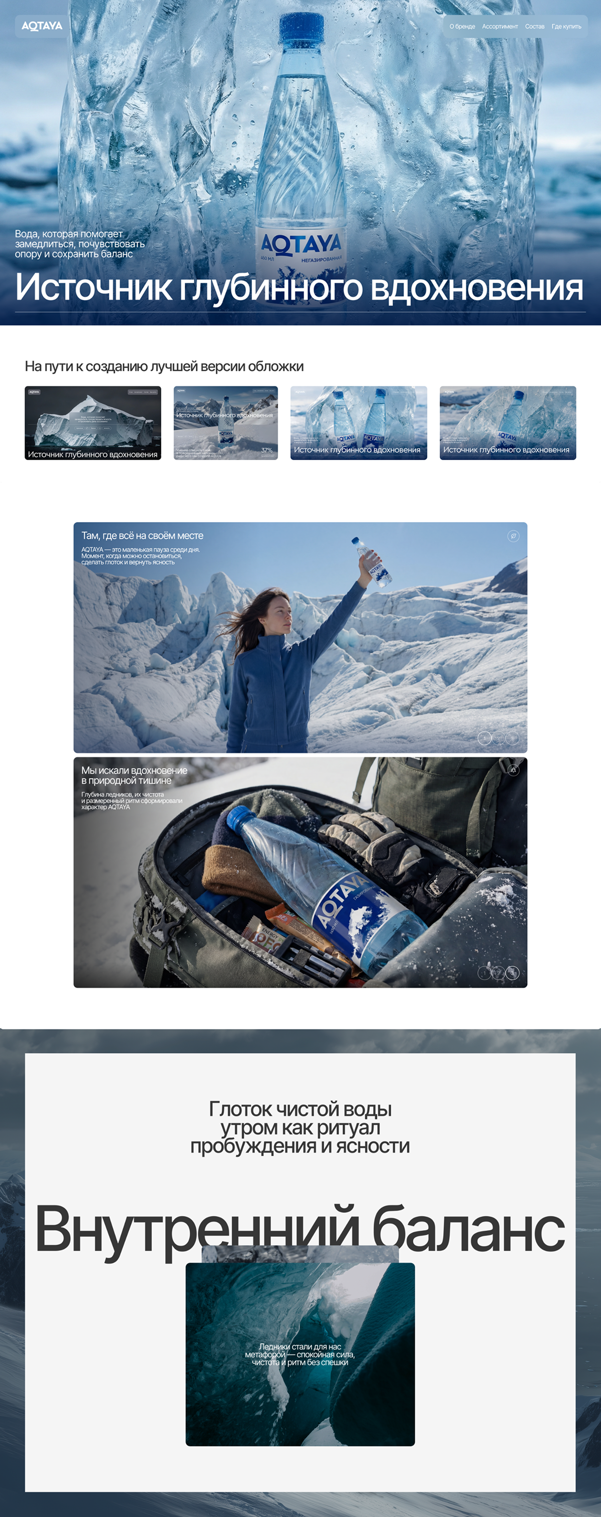 В результате у бренда воды AQTAYA появился имиджевый сайт, который раскрывает философию продукта и позволяет рассказать о нем гораздо глубже, чем это возможно на общем сайте производителя.