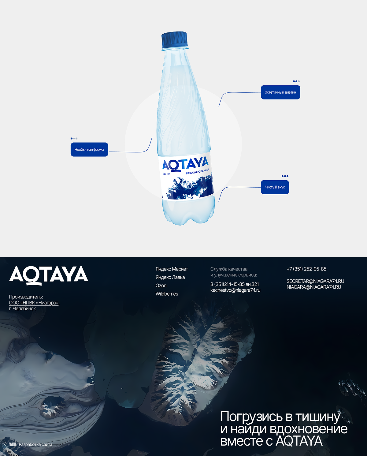 В портфеле ООО «НВК «Ниагара» более десяти брендов, от питьевой воды до энергетиков. А недавно появился новый бренд воды — AQTAYA, и Надежда, бренд-менеджер компании, обратилась к нам за разработкой имиджевого сайта.