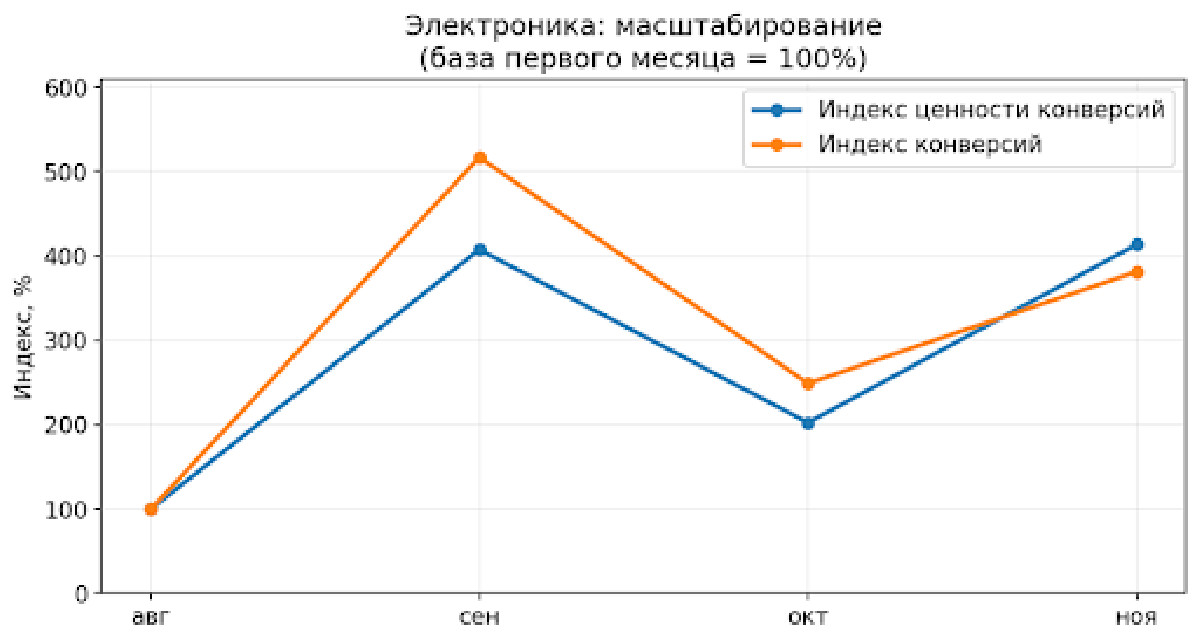 На графиках — реальные результаты из двух принципиально разных категорий: электроника (длинный цикл принятия решения, высокая цена ошибки) и гигиеническая продукция (импульсный спрос, высокая частота покупок). Мы сознательно показываем оба кейса, чтобы продемонстрировать: наши подходы к управлению трафиком работают независимо от поведения аудитории.