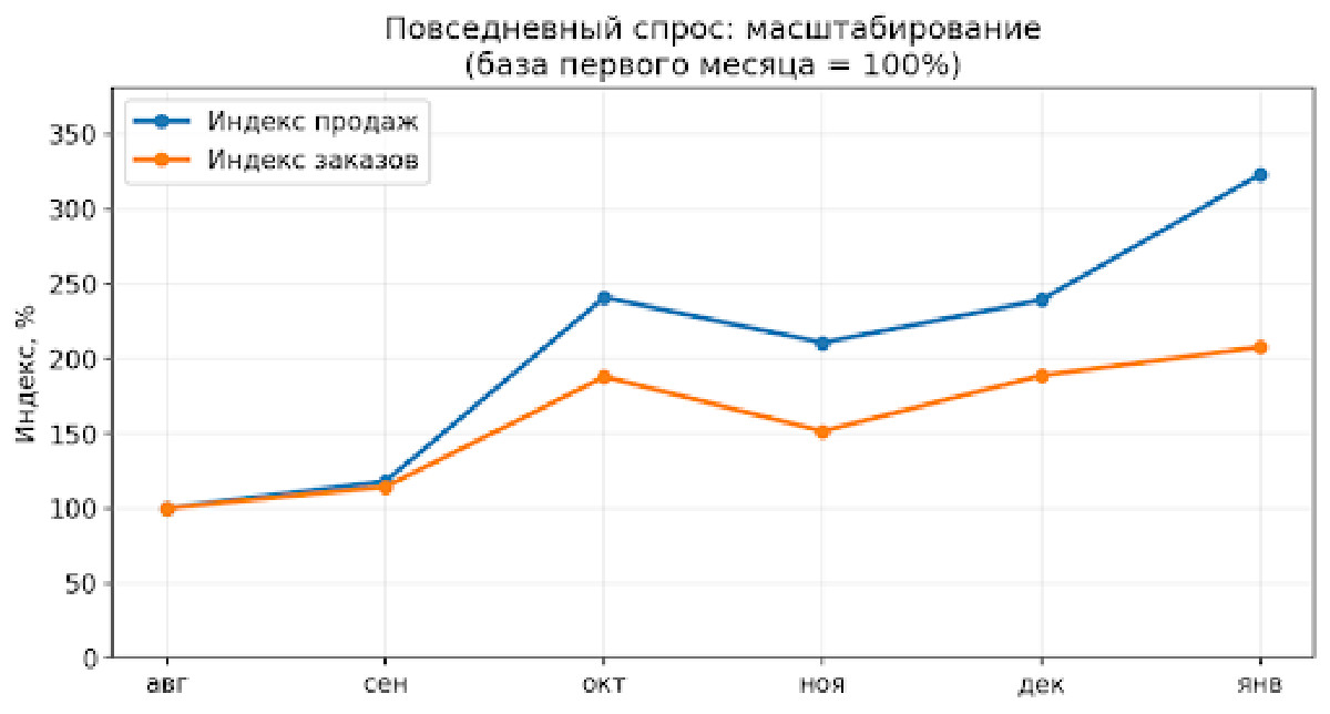 В более низком чеке системе требуется больше данных и больше конверсий, чтобы выйти на устойчивую экономику. Зато после периода обучения масштаб начинает нарастать быстрее за счет частотности спроса и снижения стоимости заказа.