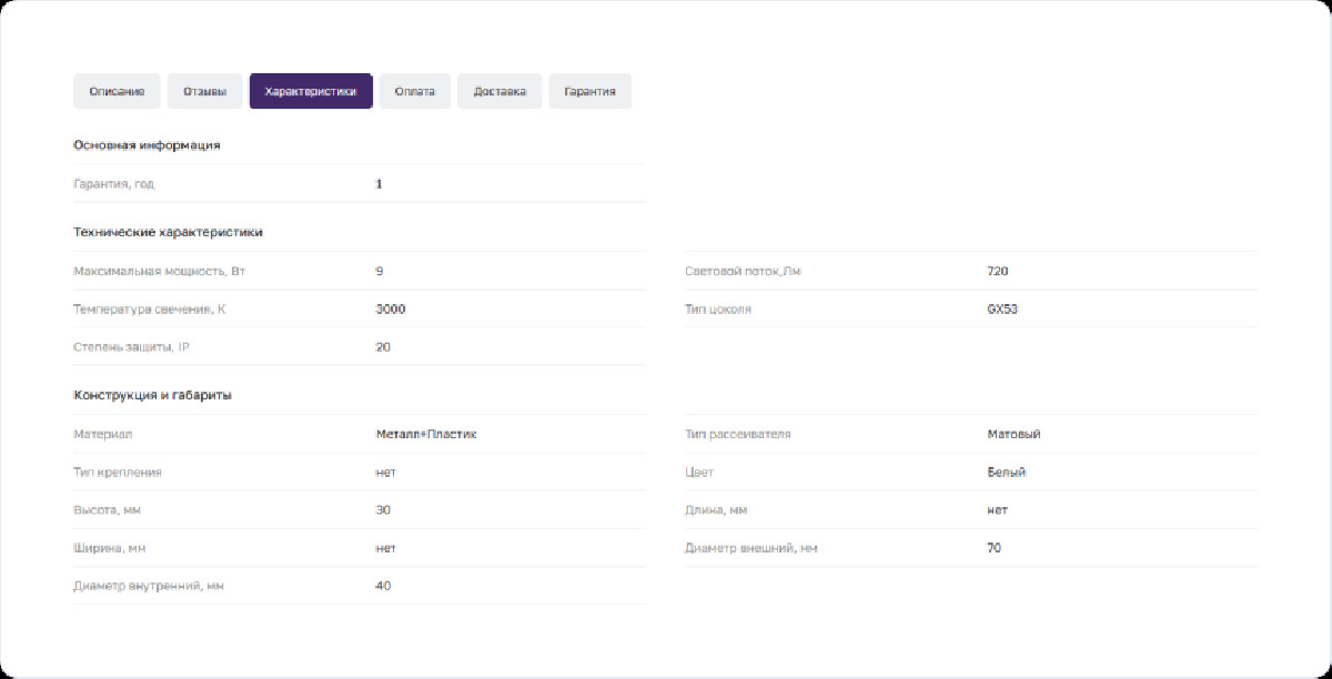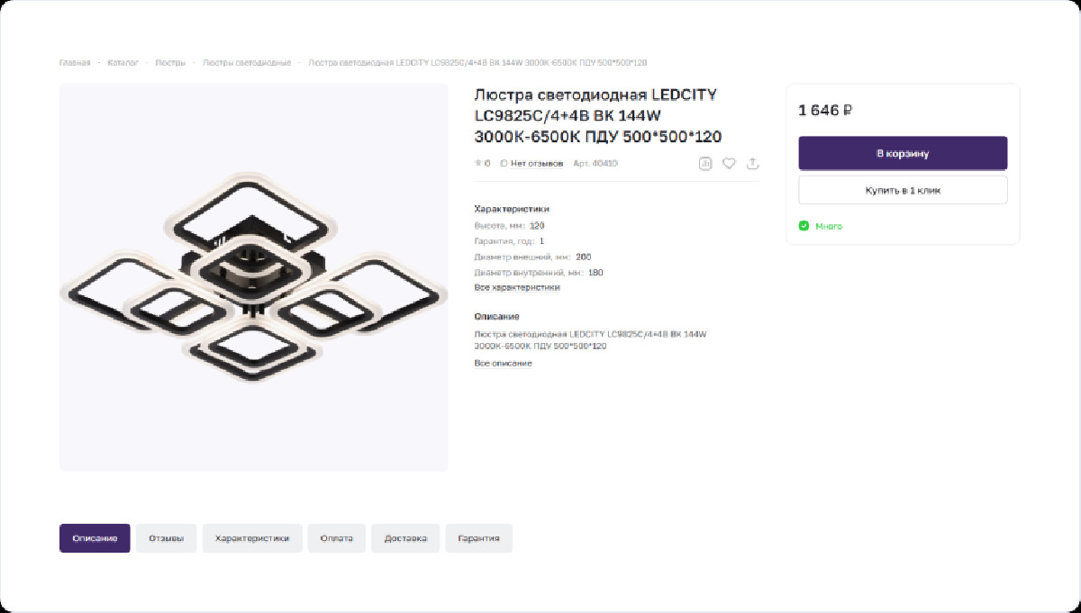 Карточку товара проработали с точки зрения удобства. Характеристики сгруппировали, чтобы упростить восприятие. Внутри карточки разместили данные о доставке, оплате и гарантии. Это позволяет пользователю принять решение без перехода по другим страницам.