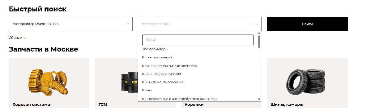 - Быстрый поиск — выбор модели техники и категории запчастей. Пользователь сразу видит только совместимые позиции.