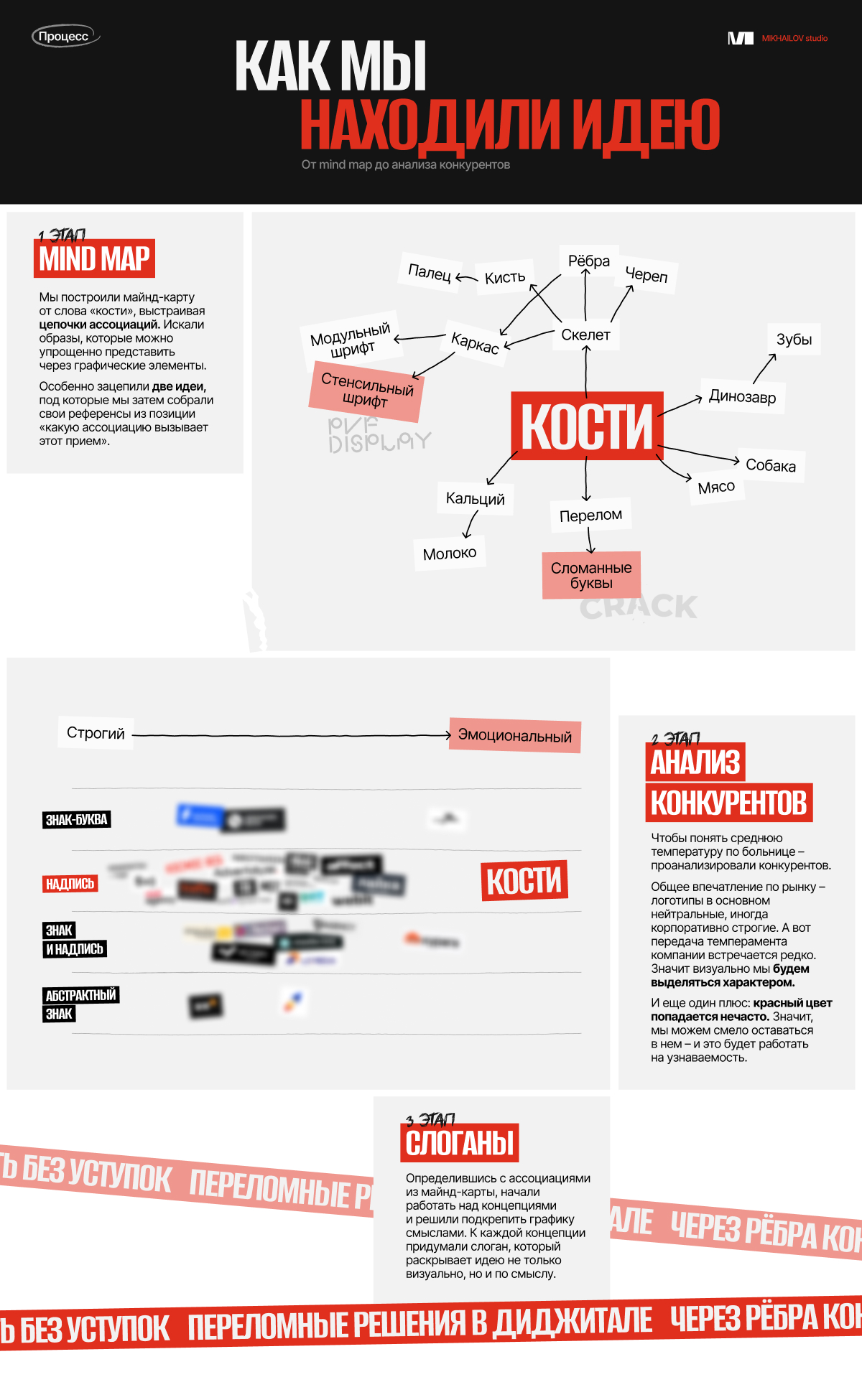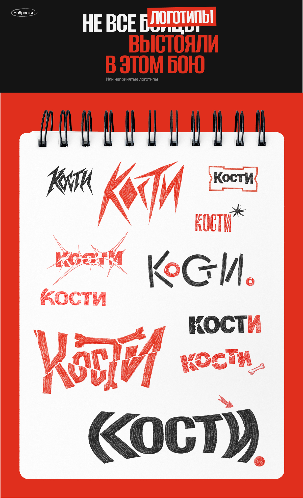 На старте Маша сказала «Хочется что-то дерзкое, с жесткими линиями, но без медицинских ассоциаций. Давайте поиграем со словом «Кости» хочется, чтобы логотип отражал название».