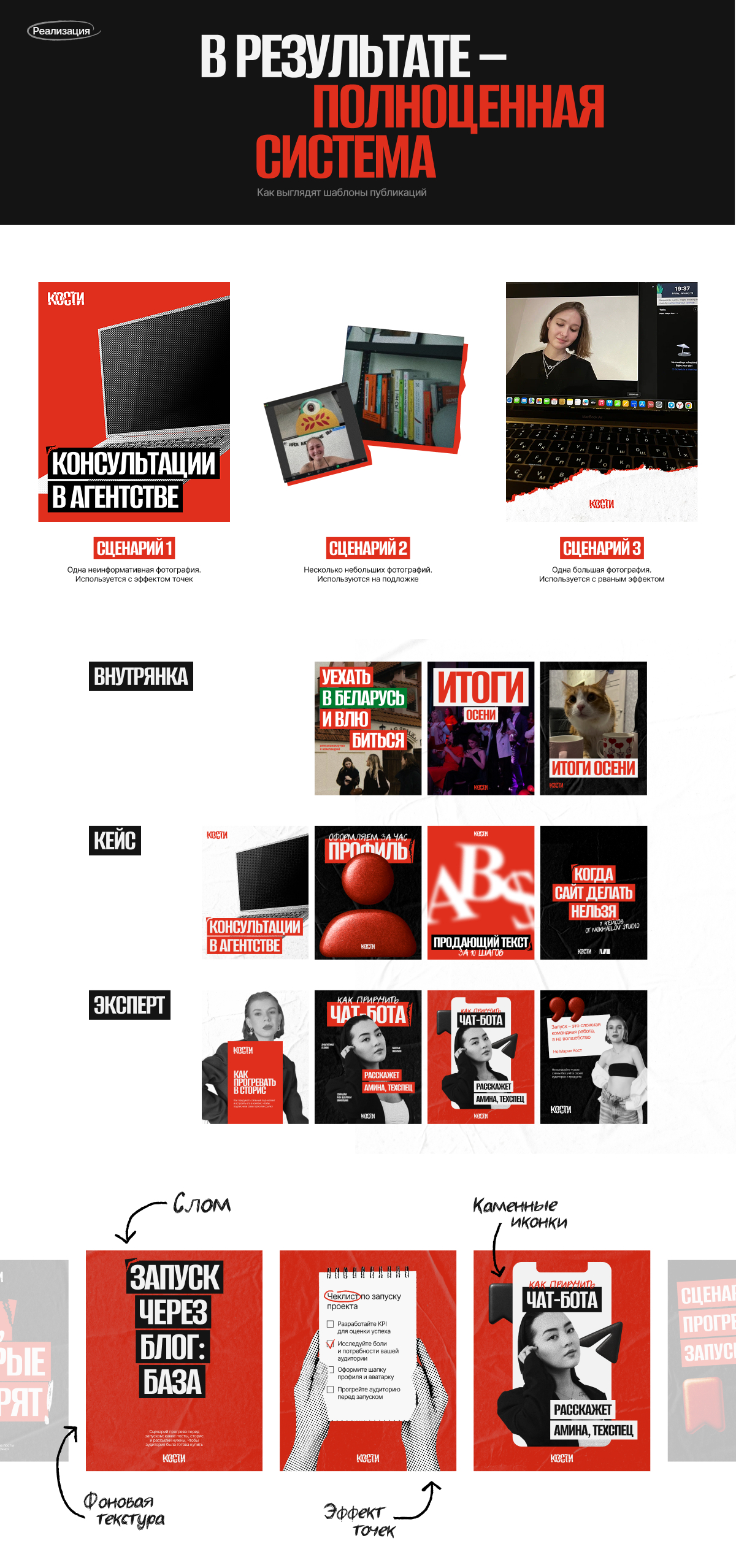 С помощью фирменного стиля удалось передать позиционирование — каждый элемент работает на общую задачу. Яркие контрастные цвета, сломы в заголовках, рваные края фотографий, фактурные фоны и разнообразие — все это создает смелый образ с характером «контента на костях».