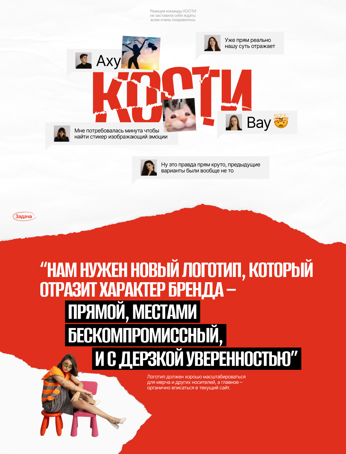После разработки логобука бренд «Кости» вернулся с новым запросом: «Мы попробовали обновить визуал, но логотип все равно существует изолированно, нам непонятно, как интегрировать его в стиль».