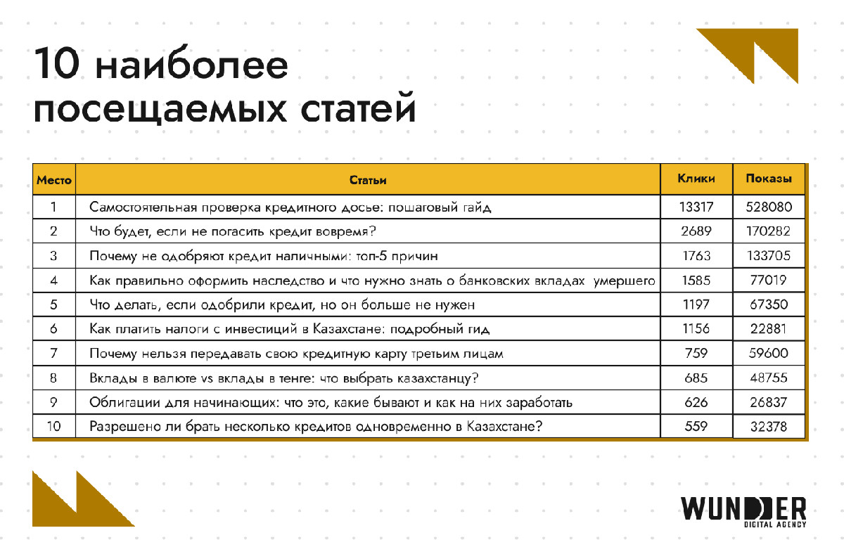За семь месяцев работы с блогом команда Wunder Digital опубликовала 63 статьи, которые дали более 32 425 переходов из органического поиска и 285 упоминаний в Google AI. Системный подход к качеству контента позволил добиться высокой плотности в выдаче: 83% всех материалов блога стабильно удерживаются на первой странице Google, занимая позиции в ТОП-10.