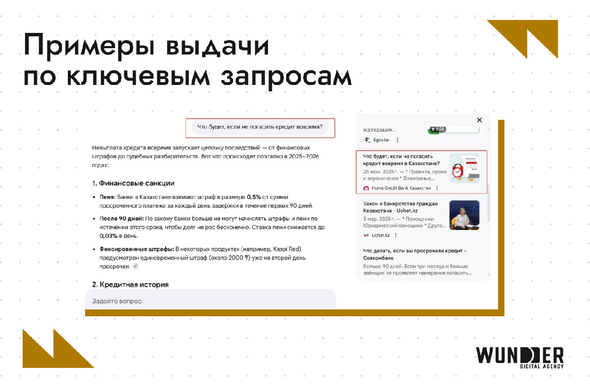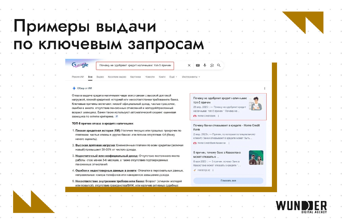 В основе подхода — работа со «сложным интентом». Пока ИИ закрывает базовые вопросы, глубокий контент привлекает пользователей с детальными запросами. Использование специфической структуры и стандартов E-E-A-T превратило статьи в качественных «доноров» для AI Overviews: экспертные материалы банка все чаще становятся первоисточником для ответов нейросети.