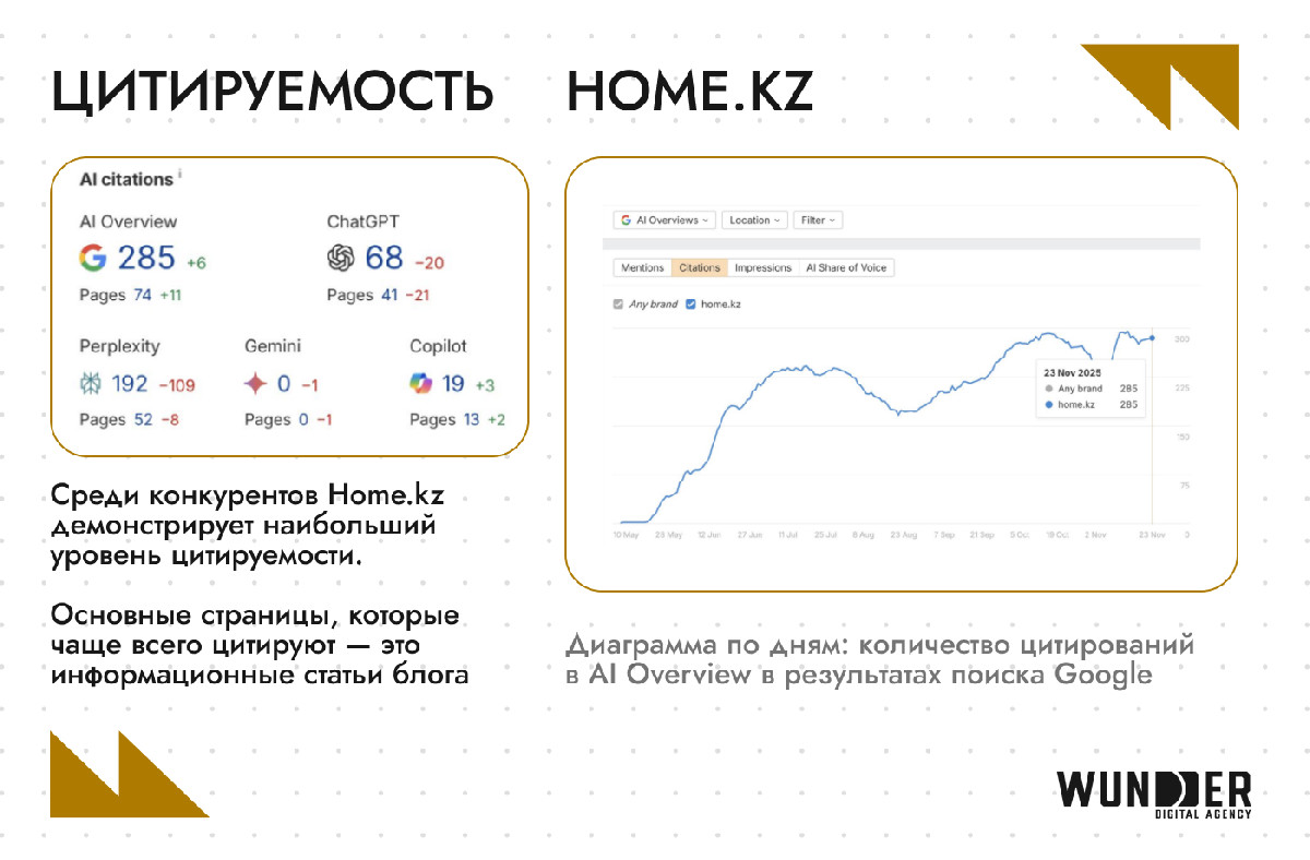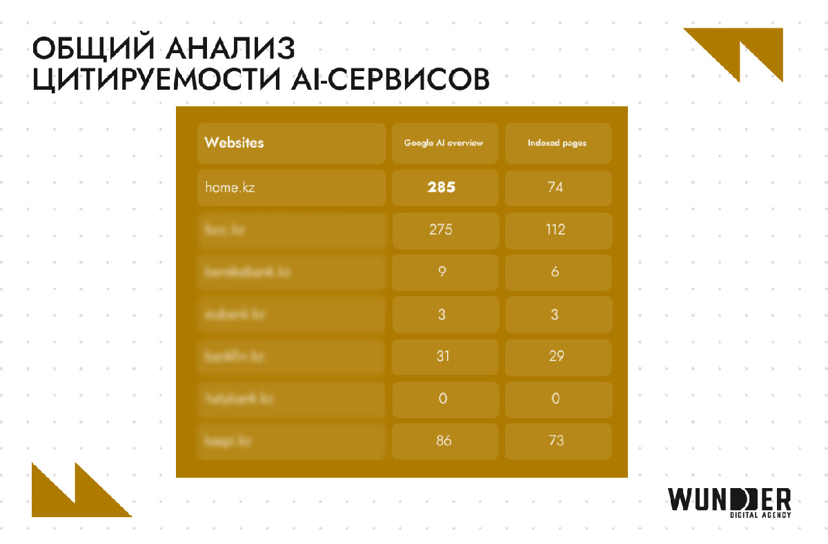 Данные наглядно демонстрируют прямую зависимость между объемом экспертных материалов и частотой упоминаний в поисковых AI-ответах. Имея библиотеку из 294 глубоко проработанных статей в блоге, home.kz получил 285 упоминаний в Google AI. Это самый высоких показателей на рынке, который подтверждает: алгоритмы воспринимают банк как авторитетный источник знаний. Для сравнения, крупные игроки рынка, которые фокусируются исключительно на продуктовых страницах и не развивают экспертные медиа-разделы, остаются для ИИ практически «невидимыми» (от 0 до 9 упоминаний в AI Overview).