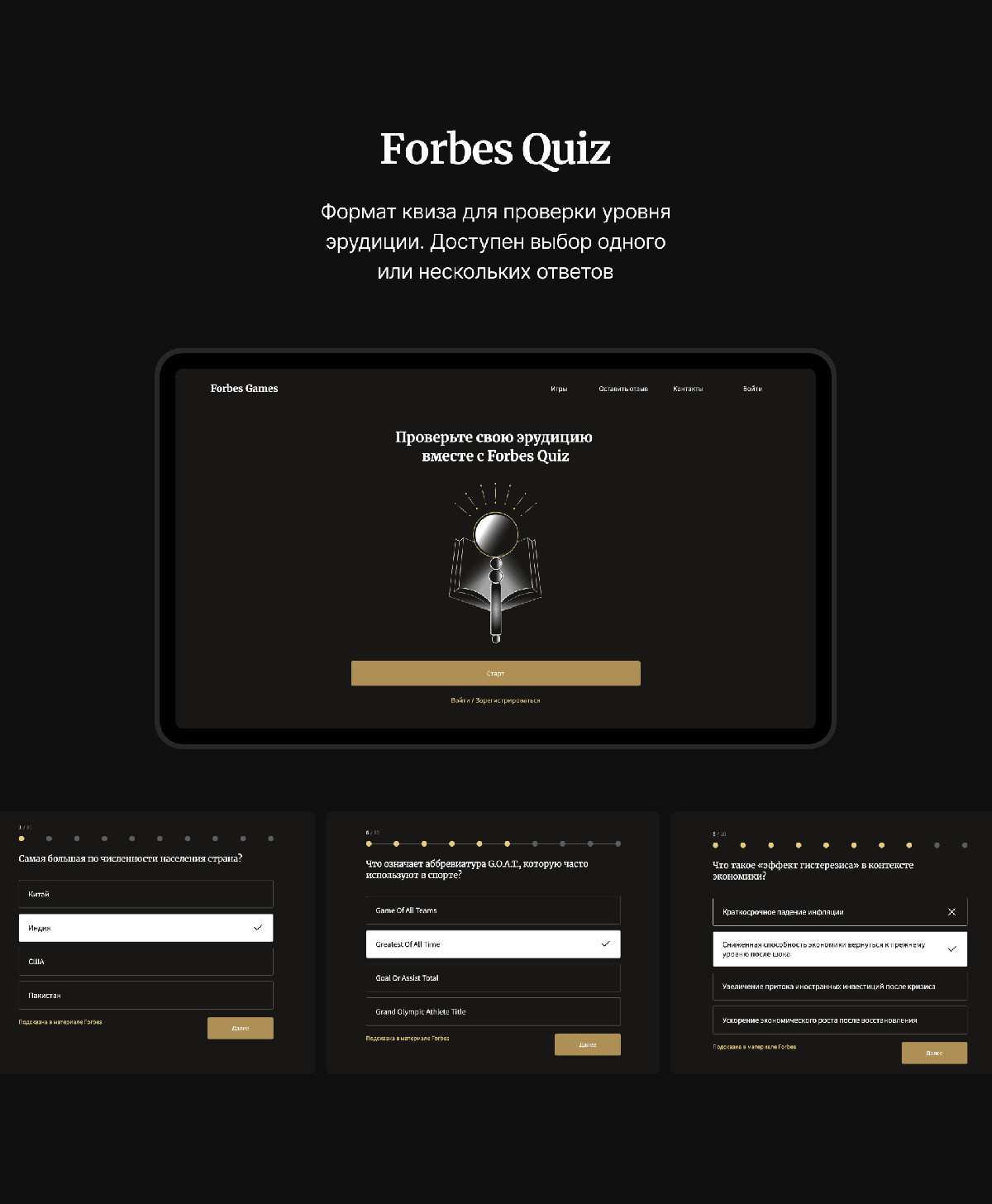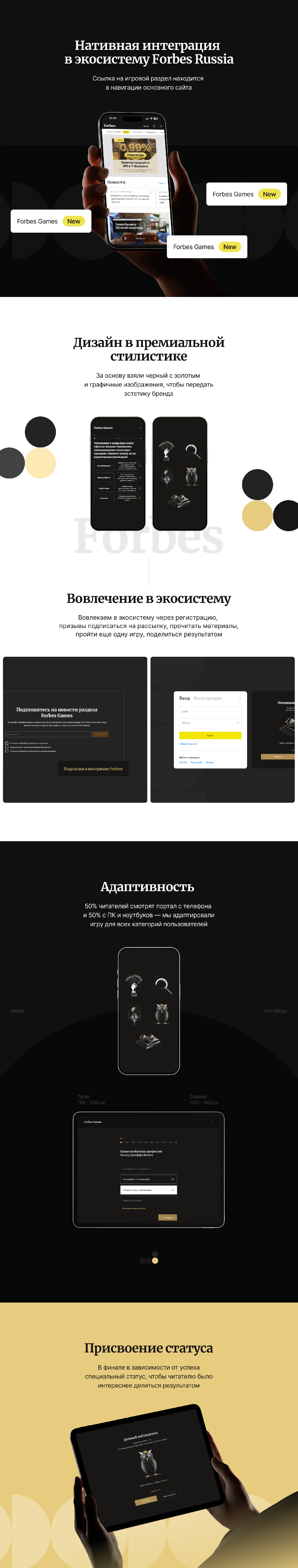 Интерфейс выполнен в фирменной стилистике Forbes: строгая палитра черный + золото, контрастные элементы, типографика в картинках и акцент на премиальность.