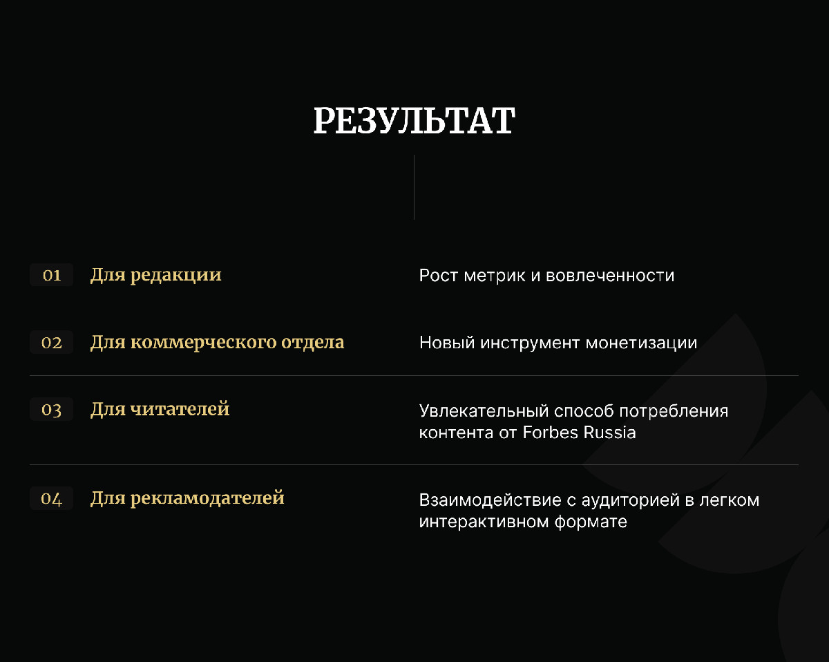 Классические форматы контента и рекламы уже используются в Forbes Russia, и команда находилась в поиске свежего решения, которое: