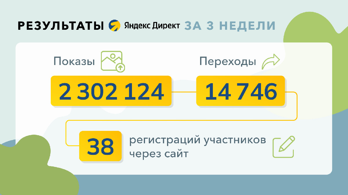 Рекламная кампания обеспечила высокий по региональным меркам охват — около 2,3 млн показов. При средней для РСЯ конверсии на уровне 0,64% это позволило привлечь порядка 15 000 посетителей за период размещения.