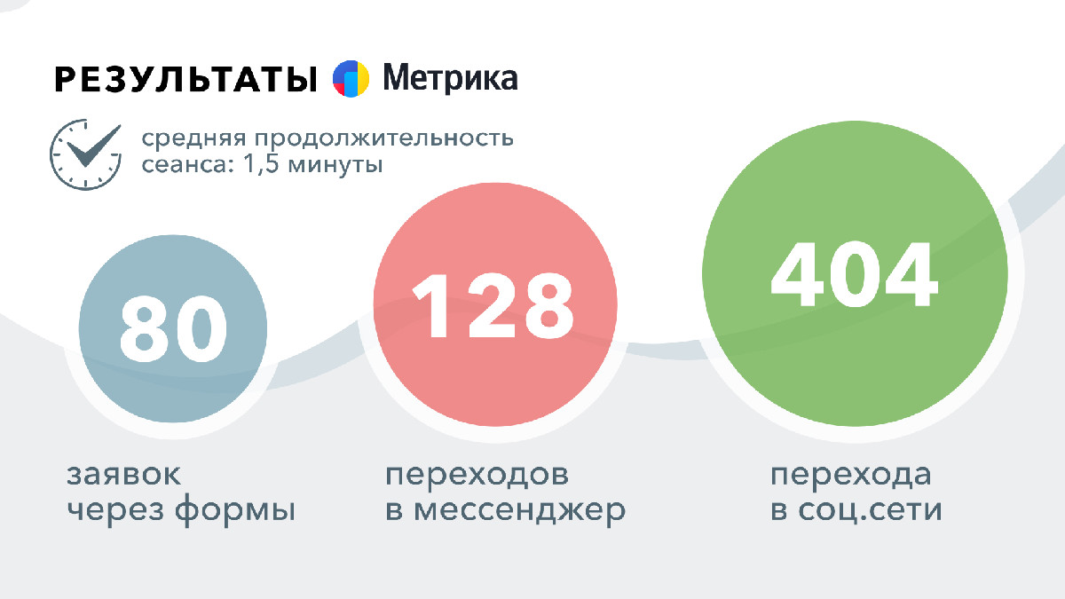 Результаты: за период продвижения зафиксировали 80 отправленных форм, 128 переходов в мессенджер и 404 перехода в социальные сети, а средняя продолжительность сеанса составила 1,5 минуты – вполне неплохо для охватного проекта.