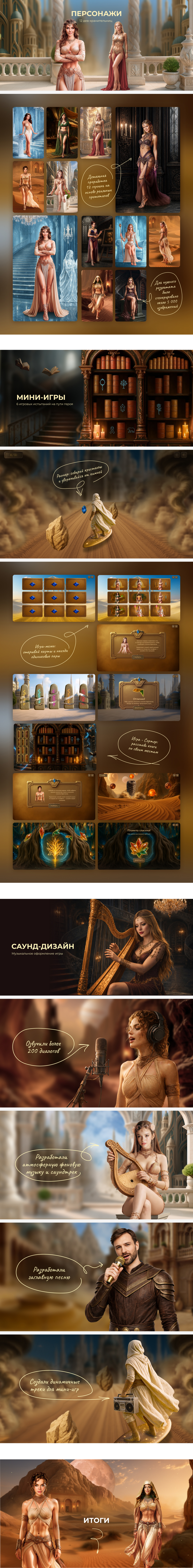 Геймифицированный сайт для Технониколь: сюжет — пустынное фэнтези «Страж песков», сценарий — 30 страниц, 10 локаций, 13 персонажей, 6 мини-игр, 200+ диалогов, музыка, видеопролог и эпилог, высокая вовлечённость. Проект — комплексный UX и геймдизайн.