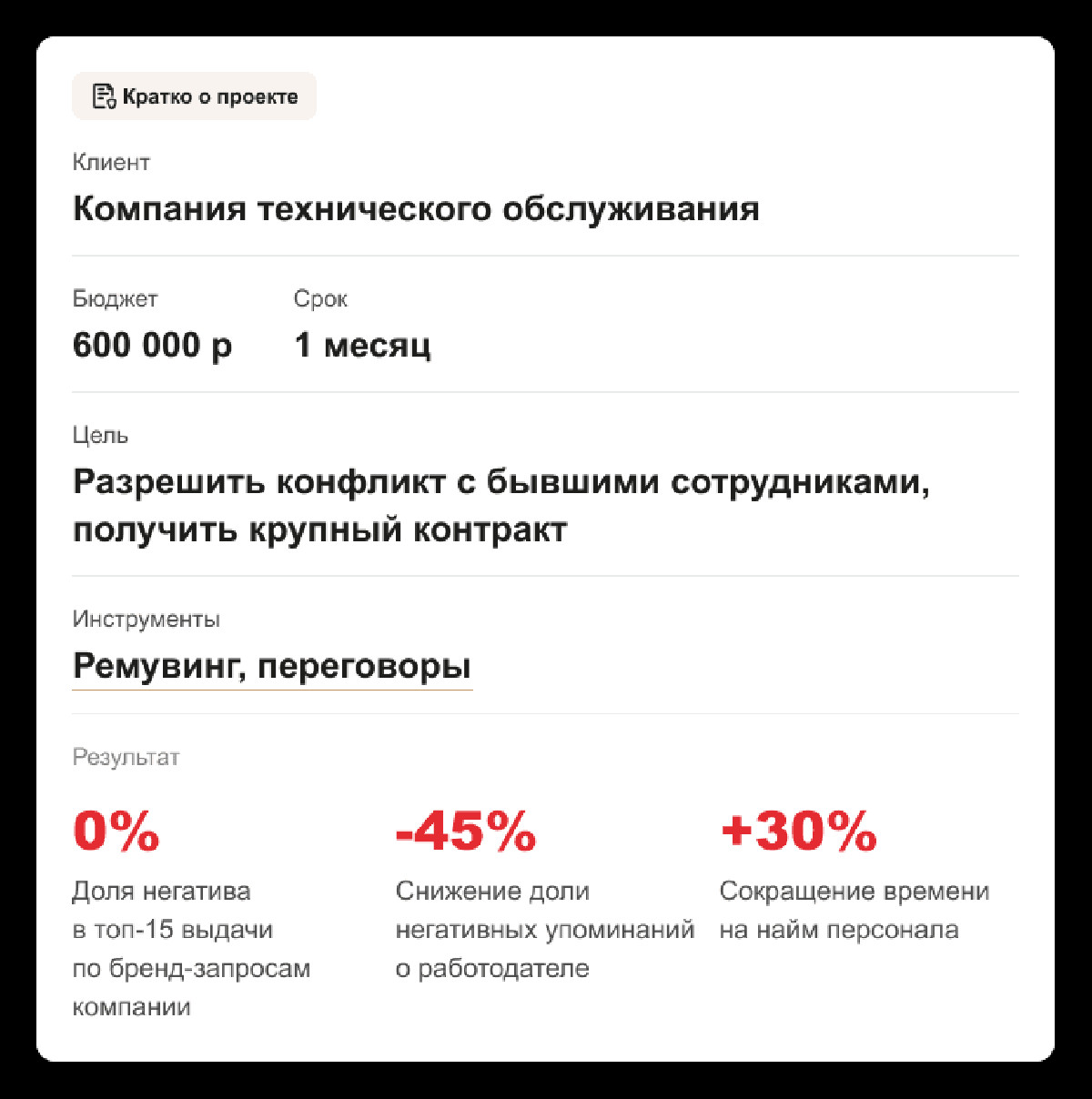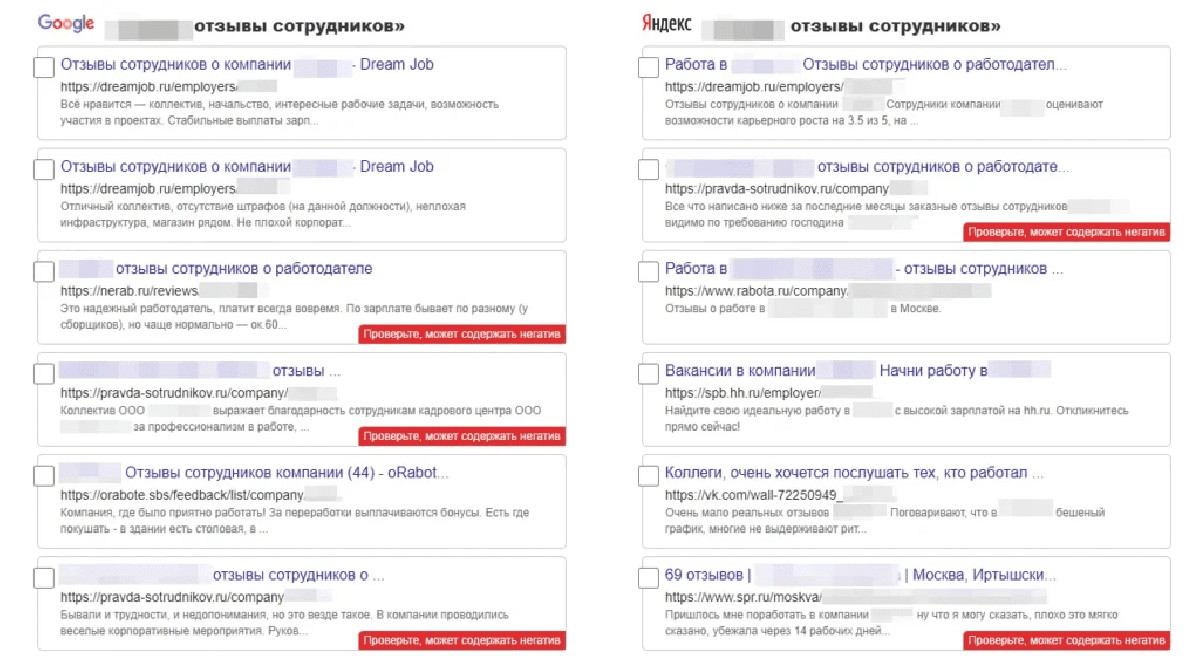 Проанализировали поисковую выдачу и нашли ссылки, из-за которых служба безопасности отказывала в прохождении проверки. Мы оценили риски удаления и взяли на себя разрешение конфликта с бывшими сотрудниками. Конструктивные комментарии отработали, а токсичные скрыли.