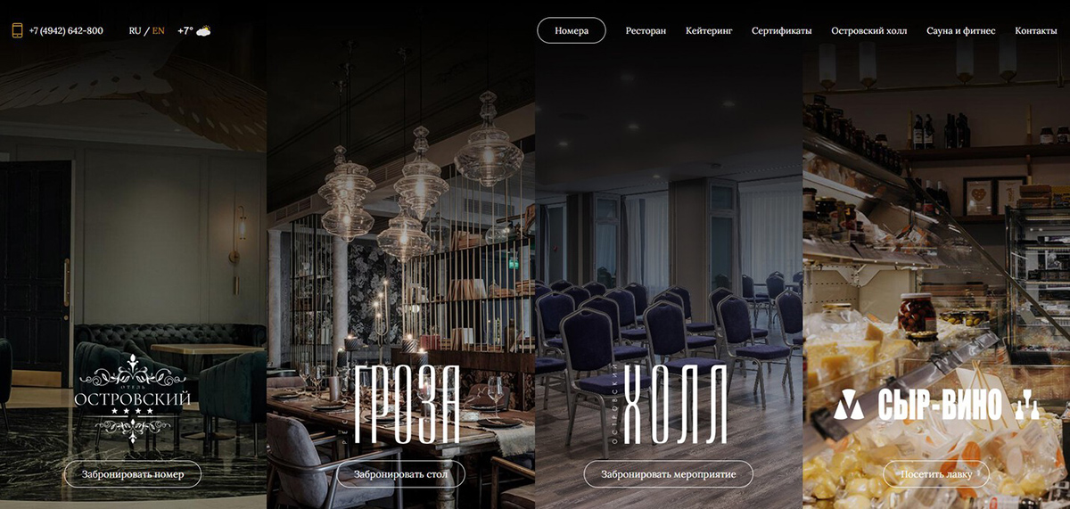 Заказчик обратился к нам с задачей создания сайта для отеля «Островский», который должен был стать не просто онлайн-визиткой, а полноценным инструментом продаж и коммуникации с гостями. Важно было объединить в одном цифровом пространстве сразу несколько направлений бизнеса: отель, ресторан и сырную лавку, сохранив при этом удобство использования и понятную структуру для пользователя.