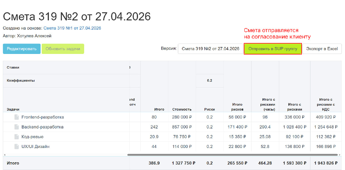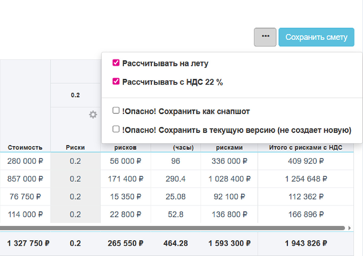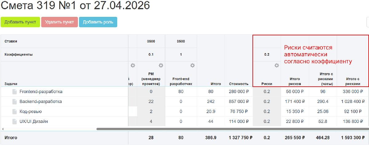 Бывают проекты с высокой долей неопределенности, когда вводной информации еще недостаточно, а клиенту нужен предварительный расчет прямо сейчас для планирования бюджета. Для таких случаев в системе закладывается рисковый буфер (10–20%). Главная фишка модуля в том, что он не выводит эти риски отдельной пугающей колонкой, а пропорционально «размазывает» их по всем задачам. Это страхует экономику проекта и снимает лишние возражения при согласовании.