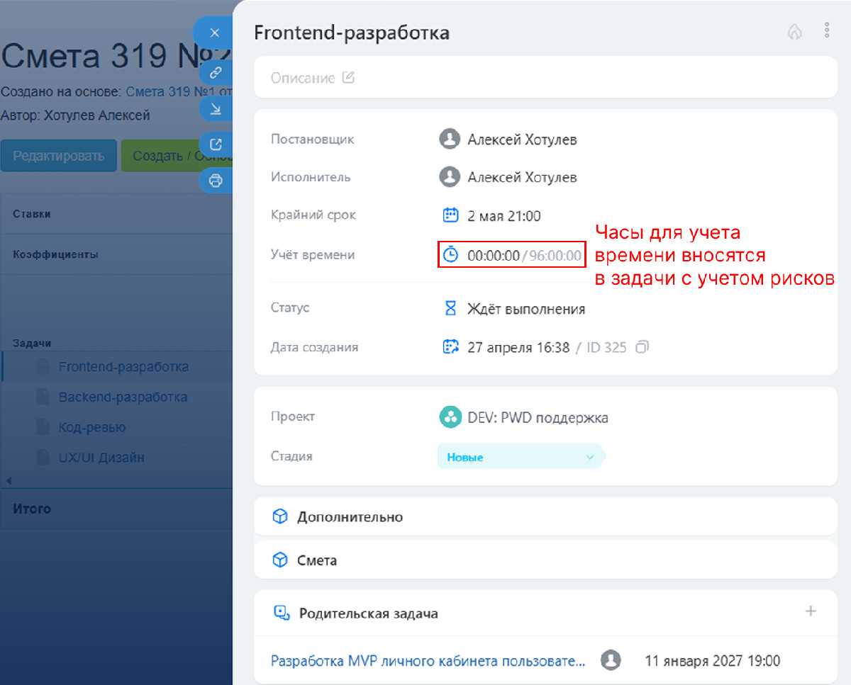 Часы, которые были заложены и проданы в смете, автоматически подтягиваются в систему как плановое время на выполнение конкретных задач.