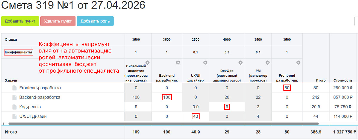 Менеджер вводит вручную только базовое время (например, профильного специалиста), а часы сопутствующих ролей считаются автоматически как процент от базы. В нашем случае код-ревью забирает 5% от разработки, арт-директор — 5% от работы дизайнера, а менеджмент — 10% от всего времени проекта. Этот алгоритм настраивается под любые ниши.