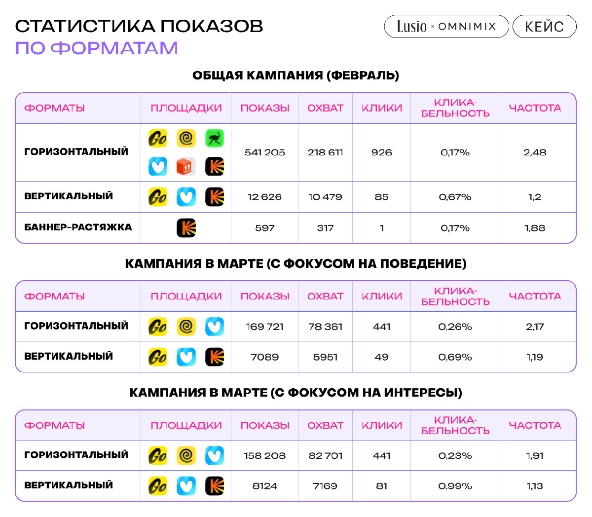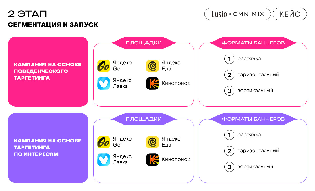 В обеих кампаниях использовались те же площадки и форматы, что и на первом этапе: