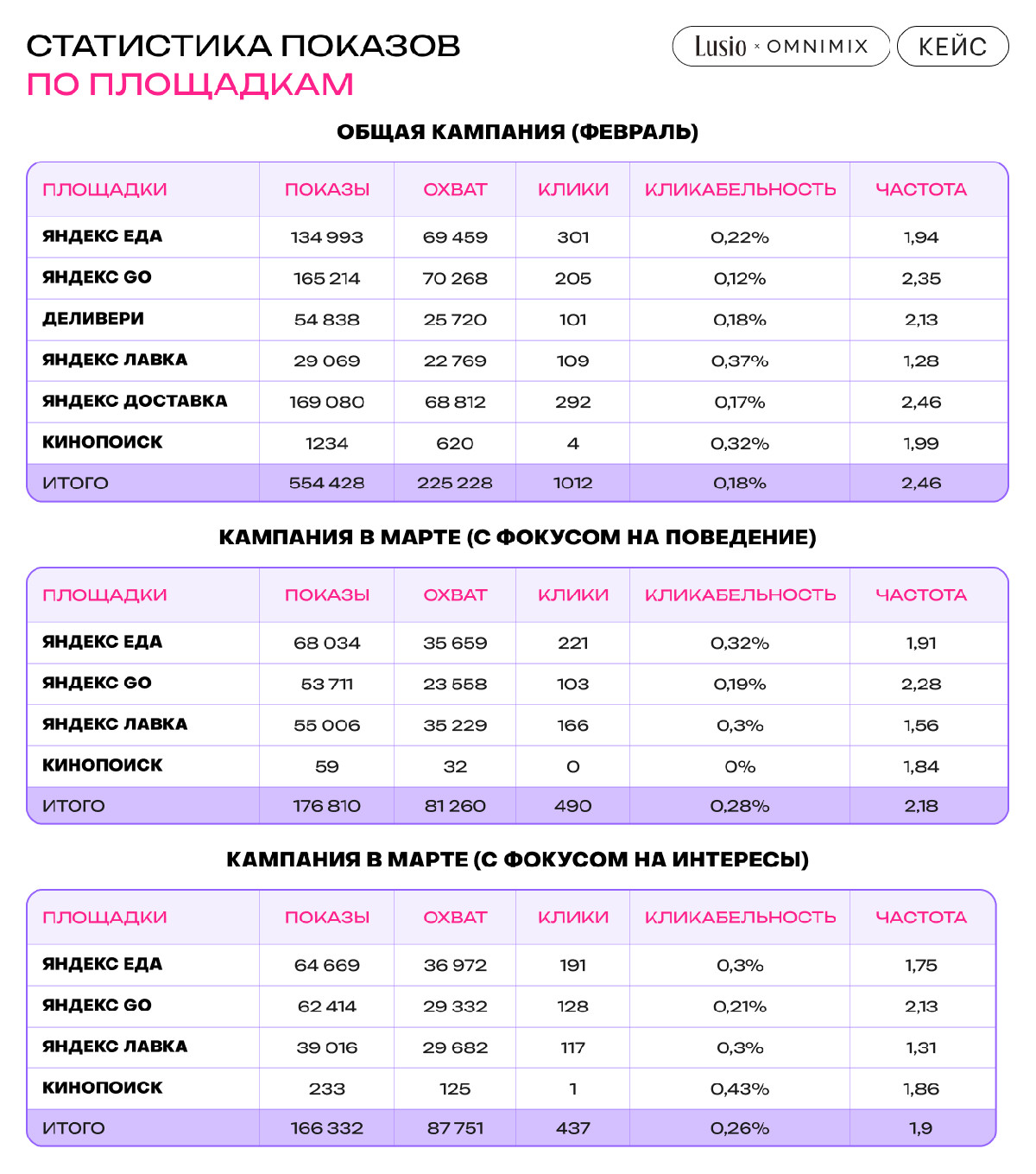 - увеличении охвата внутри платформы Urban Ads (Яндекс Еда, Яндекс Доставка, Яндекс Лавка, Яндекс Go, Кинопоиск, Delivery)