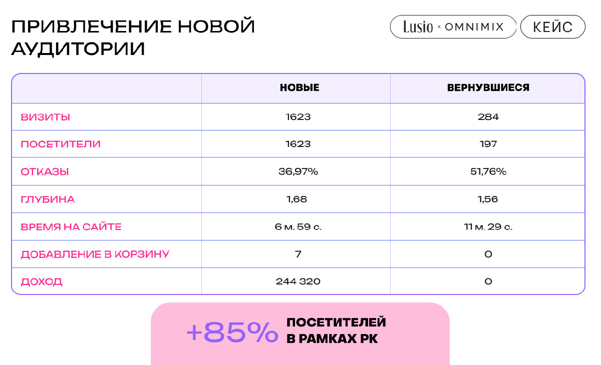 OMNIMIX и LUSIO протестировали Urban Ads как новый канал продвижения для расширения охвата и привлечения платежеспособной аудитории. Кампания помогла увеличить узнаваемость бренда: 85% трафика пришло от новых пользователей, часть из которых совершила целевые действия.