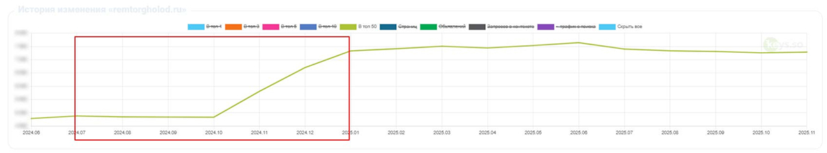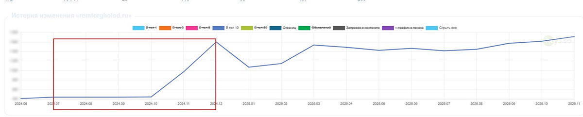 Мы продолжаем заниматься продвижением и развитием сайта remtorgholod.ru. Важно понимать, что SEO — не просто комплекс работ по улучшению ресурса, а продуманная стратегия, требующая постоянных корректировок с учётом изменения алгоритмов ранжирования и поведения конкурентов. Для нас важно не только вывести сайт клиента в ТОП, но и помочь ему там удержаться, обеспечивая постоянный рост конверсий и прибыли.