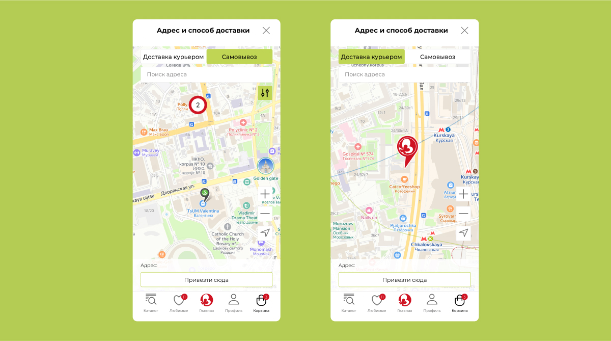 - При оформлении заказа пользователь может выбрать один из двух способов доставки: доставку курьером или самовывоз. Для удобства работы пользователей с картой при самовывозе была реализована кластеризация точек вывоза заказов, фильтрация по службе доставки и подключение только тех точек, которые находятся в квадрате координат, отображаемом на экране.