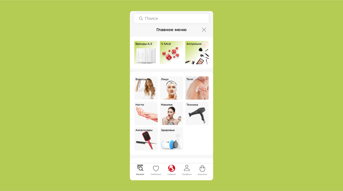В данном разделе пользователь может перейти к поиску нужных ему брендов, зайти на страничку акций и актуальных на данный момент товаров среди пользователей.