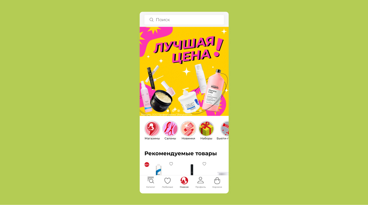 На главной странице находится карусель баннеров, акции и специальные предложения в формате stories. А также рекомендуемые товары, популярные бренды и категории.