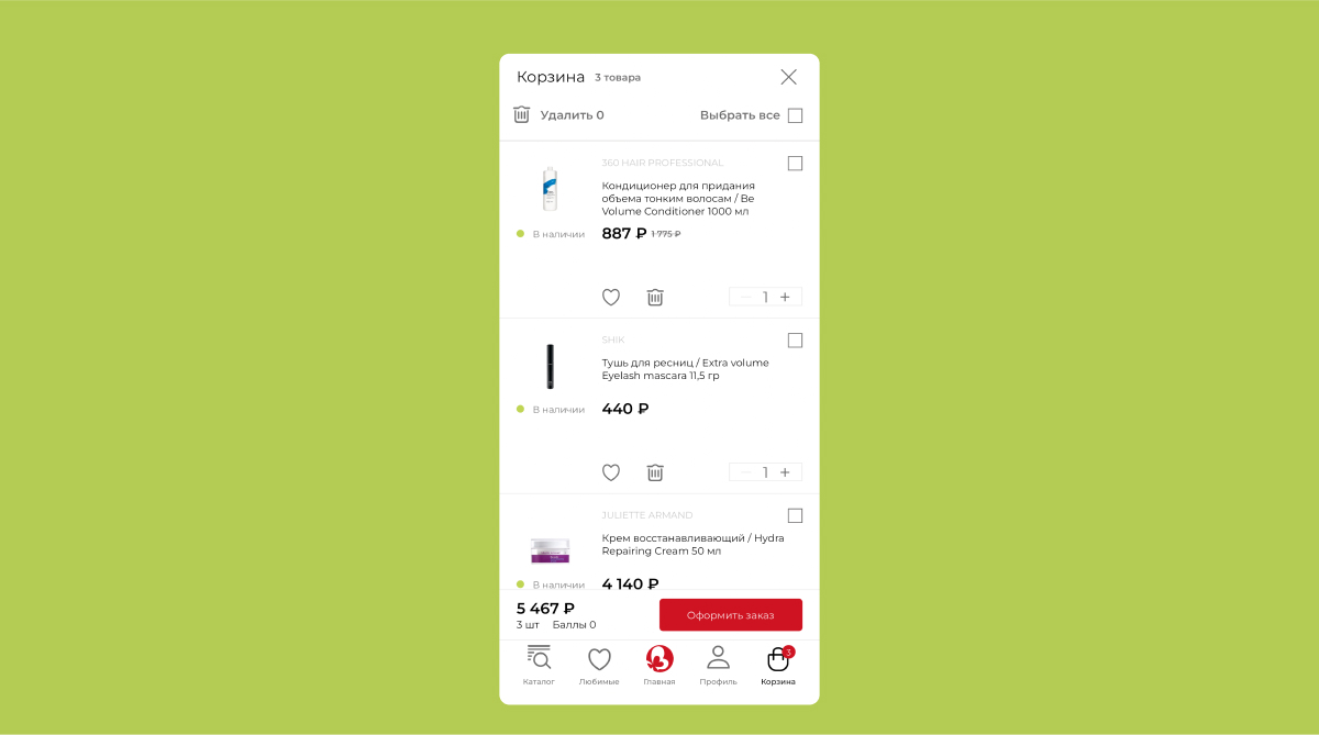 В корзине есть поле для промокода и удобная визуализация списания баллов.